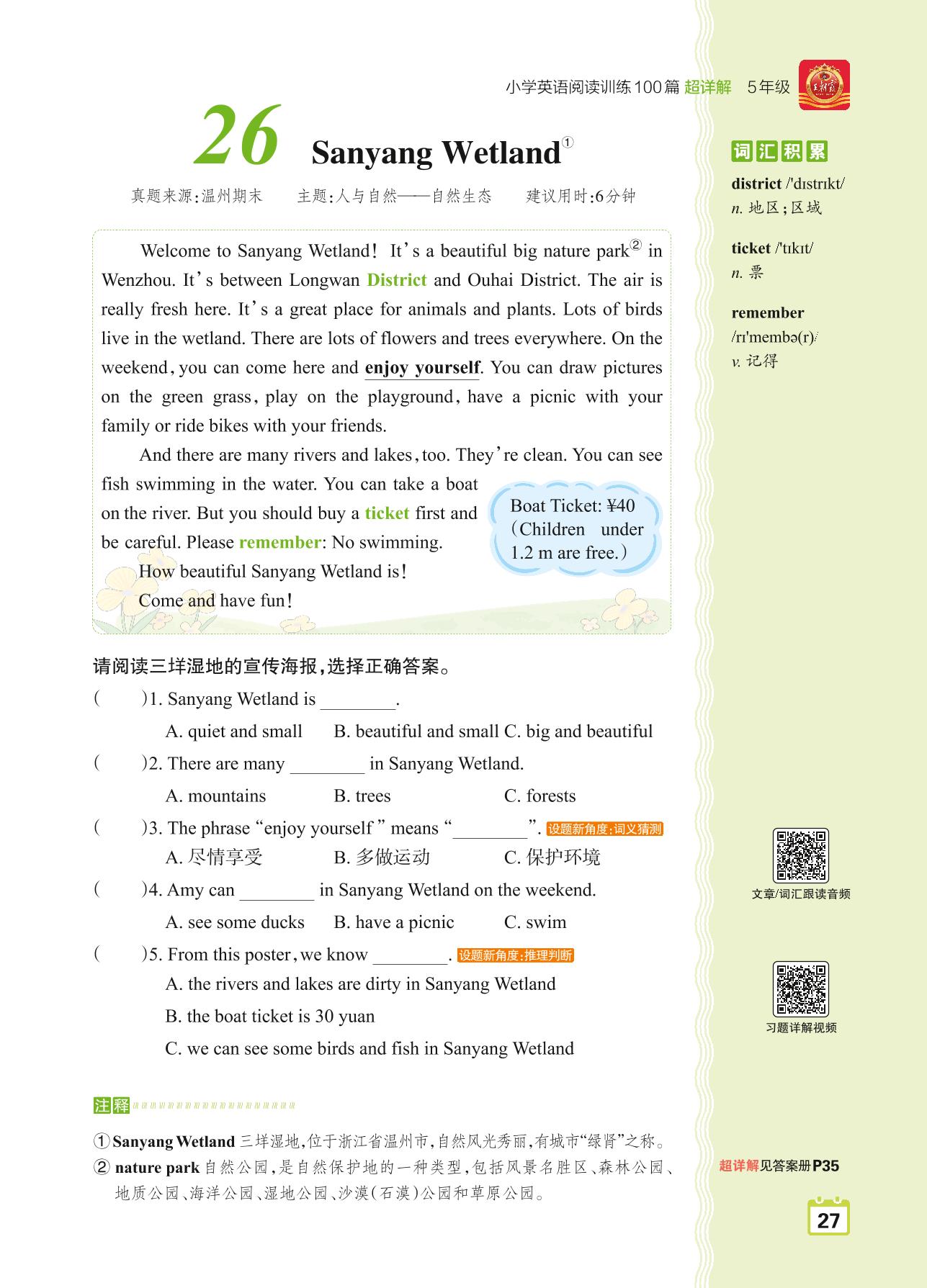 五年级英语阅读超详解 Part1 青铜篇:26 Sanyang Wetland