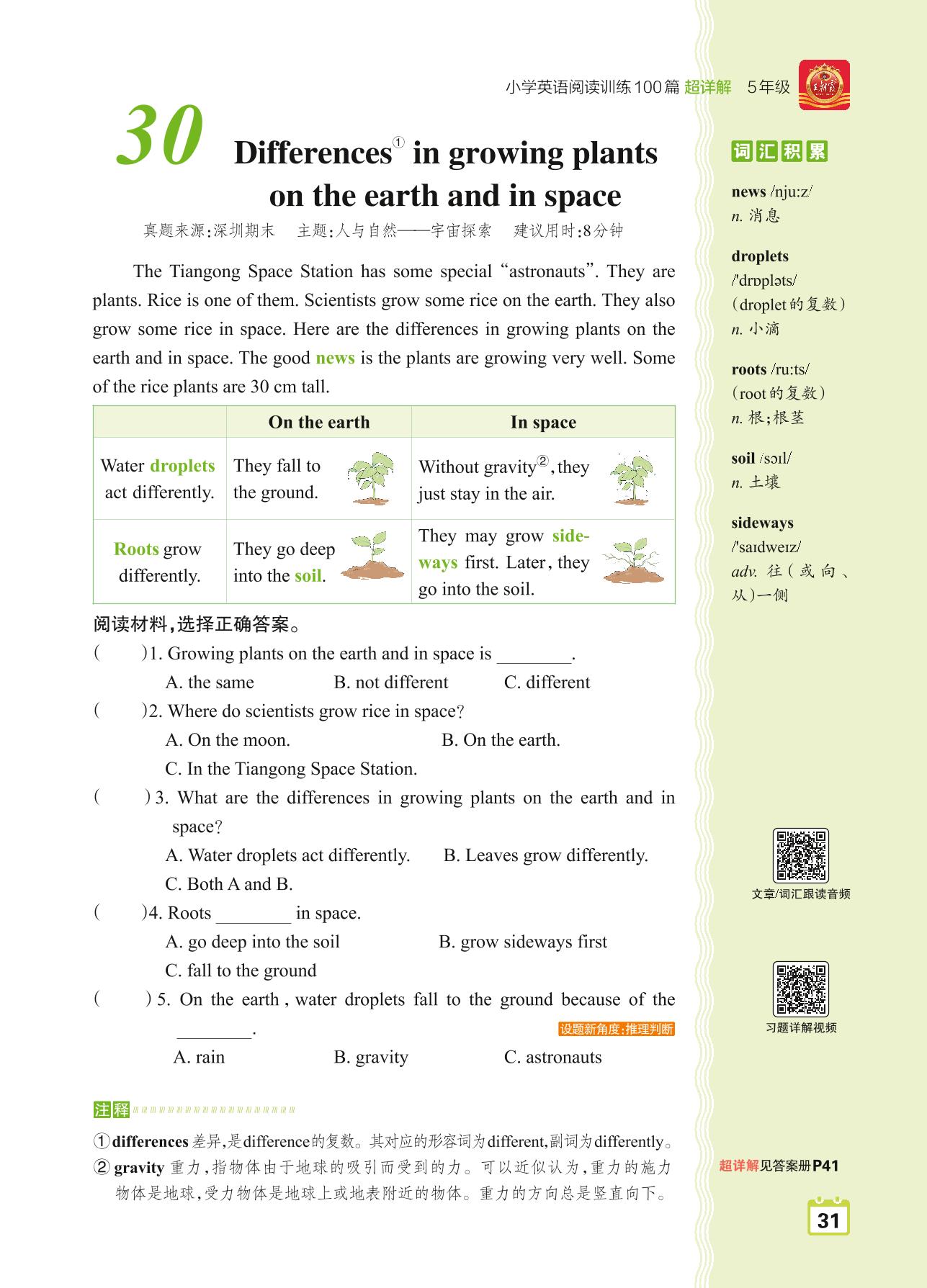 五年级英语阅读超详解 Part1 青铜篇:30 Differences in growing plants on the earth and in space