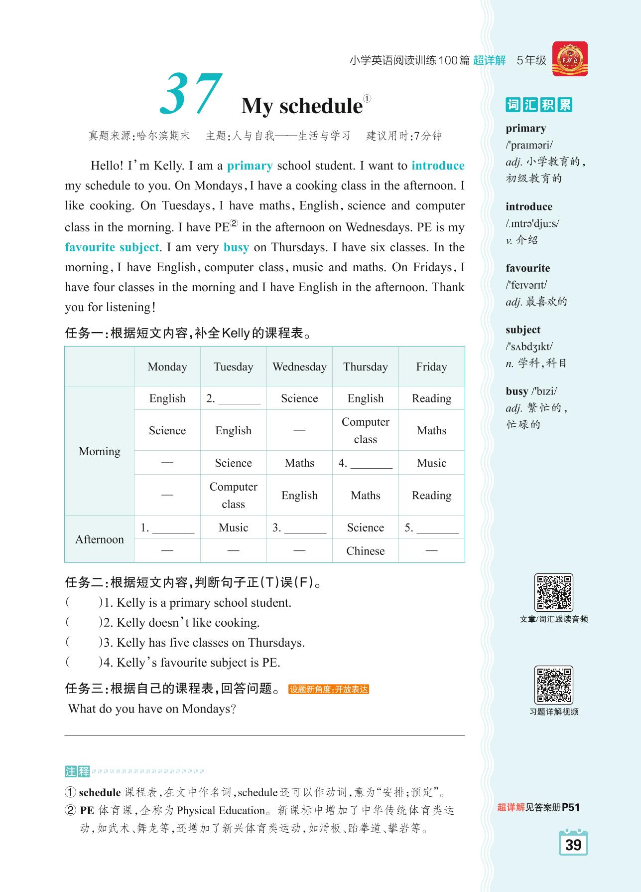 五年级英语阅读超详解 Part2 黄金篇:37 My schedule