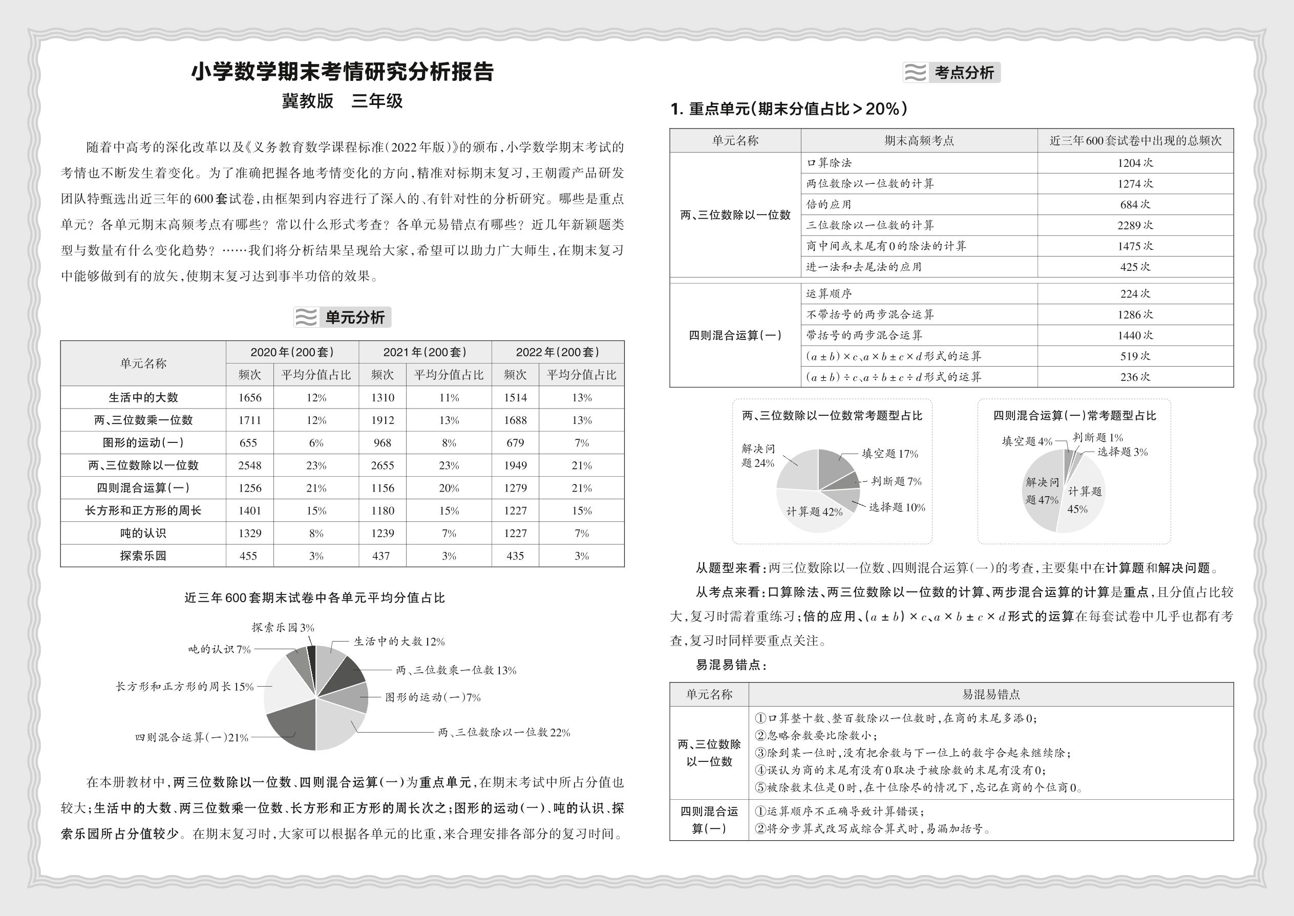小学数学冀教版三年级期末考情研究分析报告(2023秋)