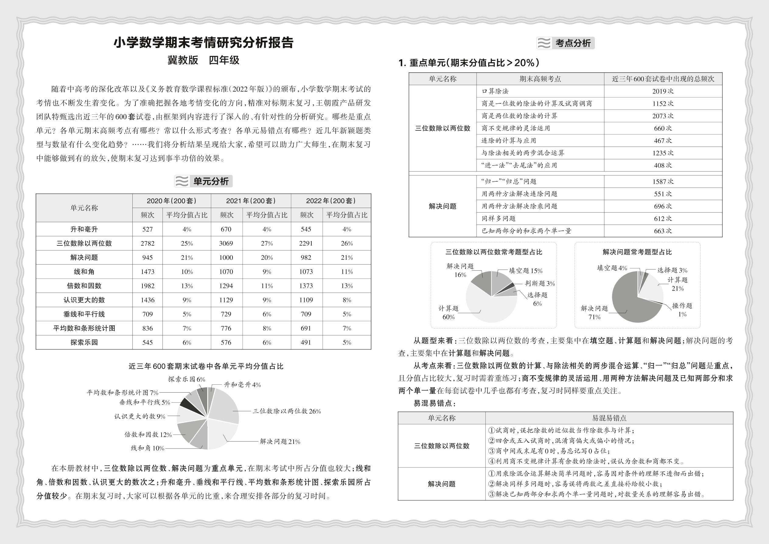 四年级数学冀教版上册考情分析