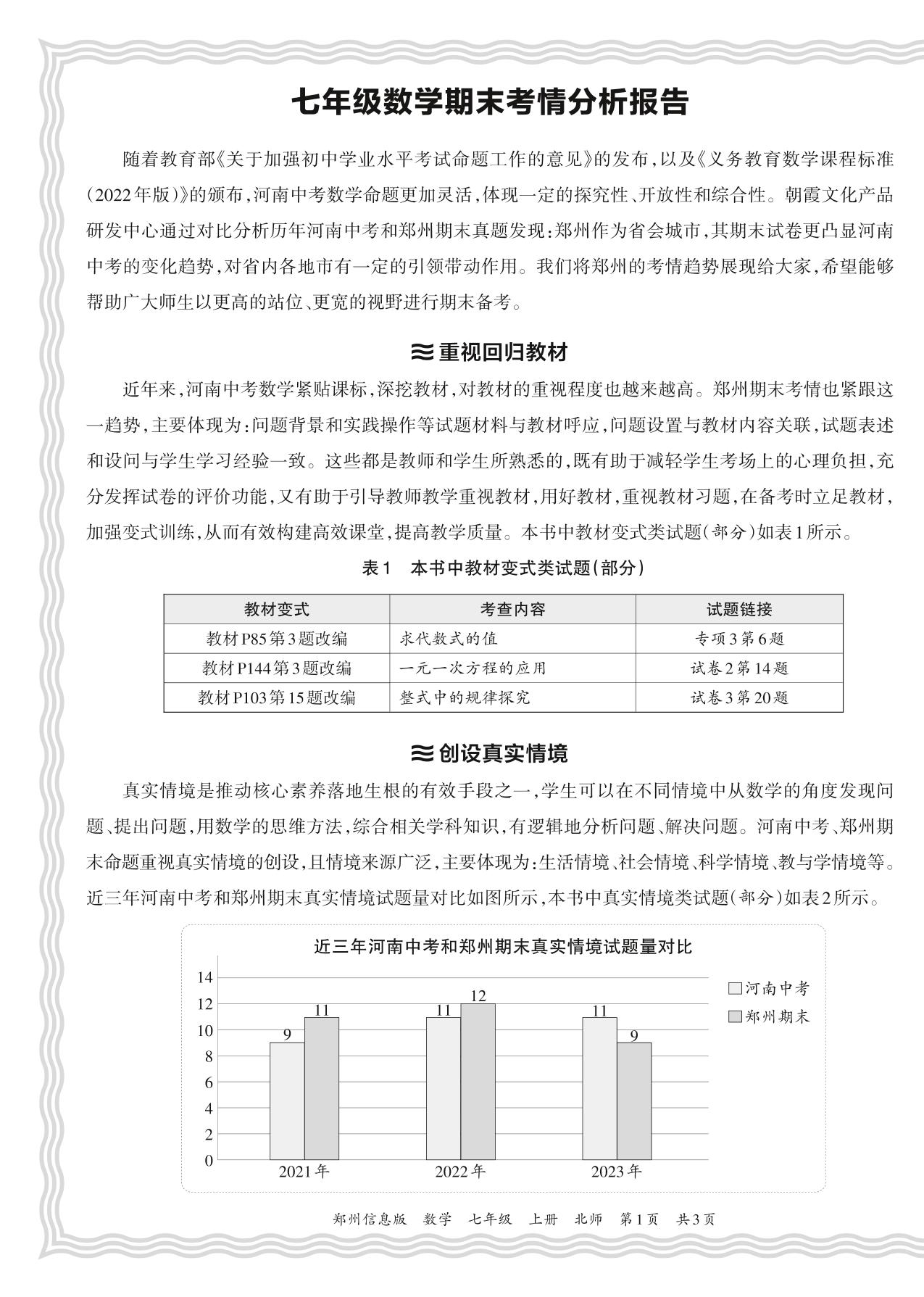 初中数学北师版七年级期末考情分析报告(2023秋郑州)