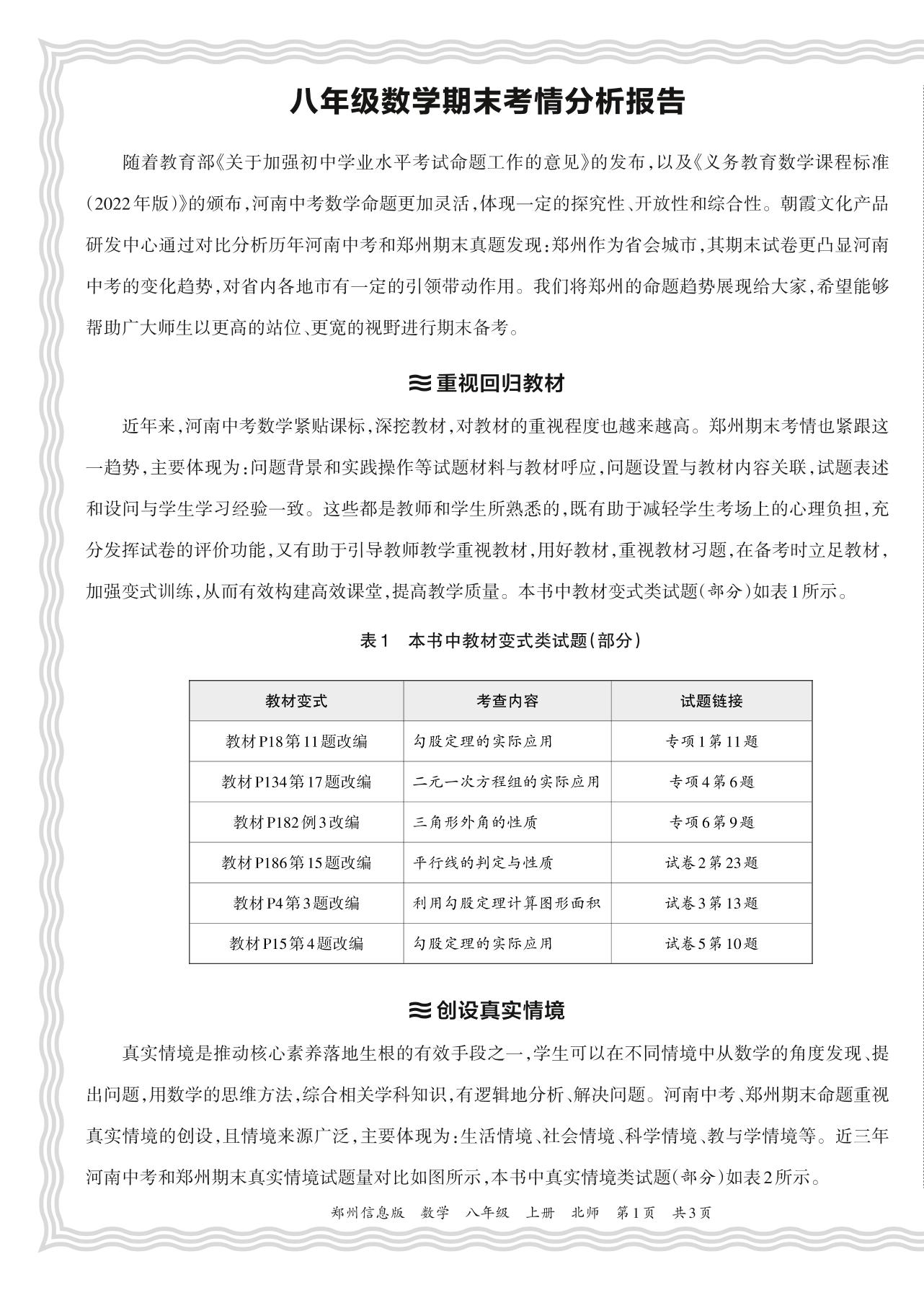 初中数学北师版八年级期末考情分析报告(2023秋郑州)