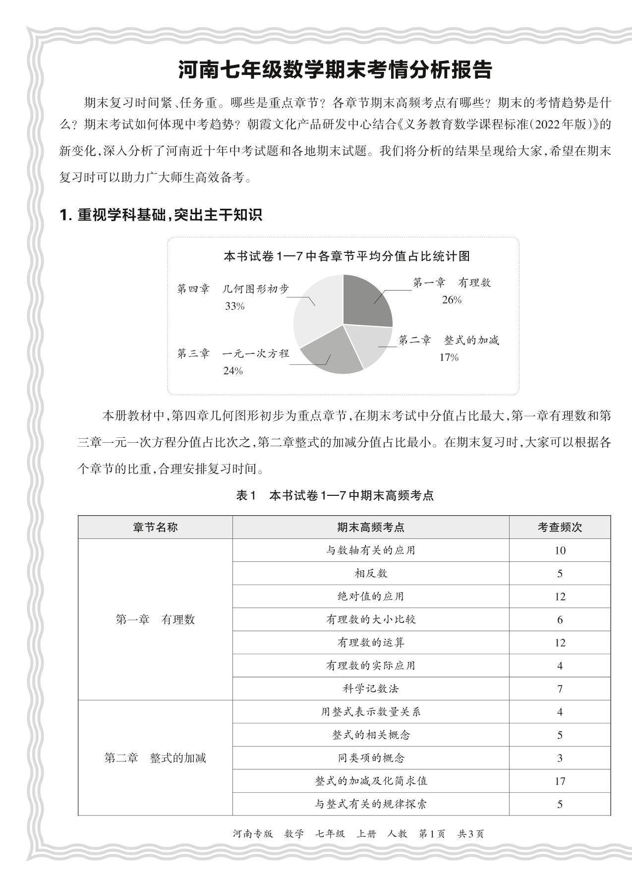 初中数学人教版七年级期末考情分析报告(2023秋河南)