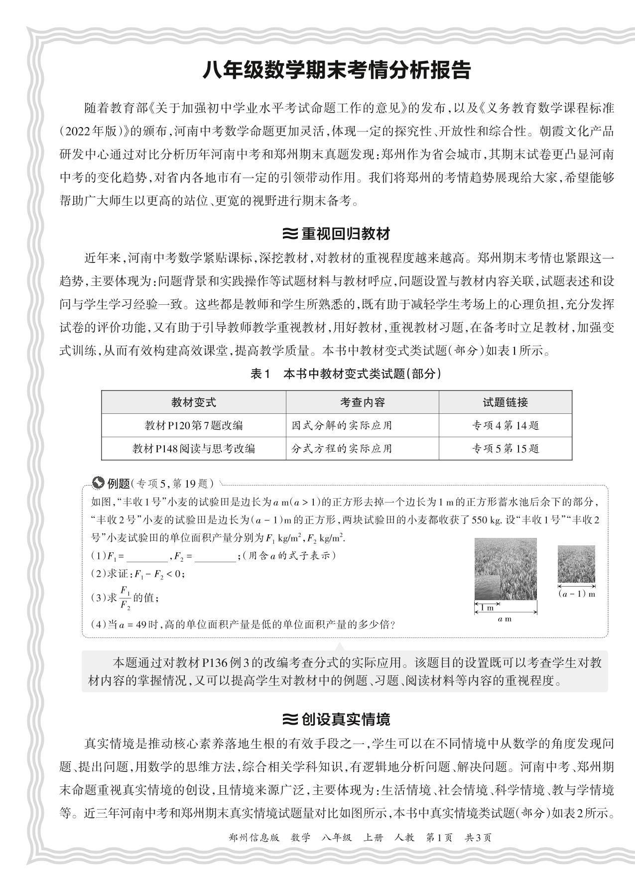 初中数学人教版八年级期末考情分析报告(2023秋郑州)