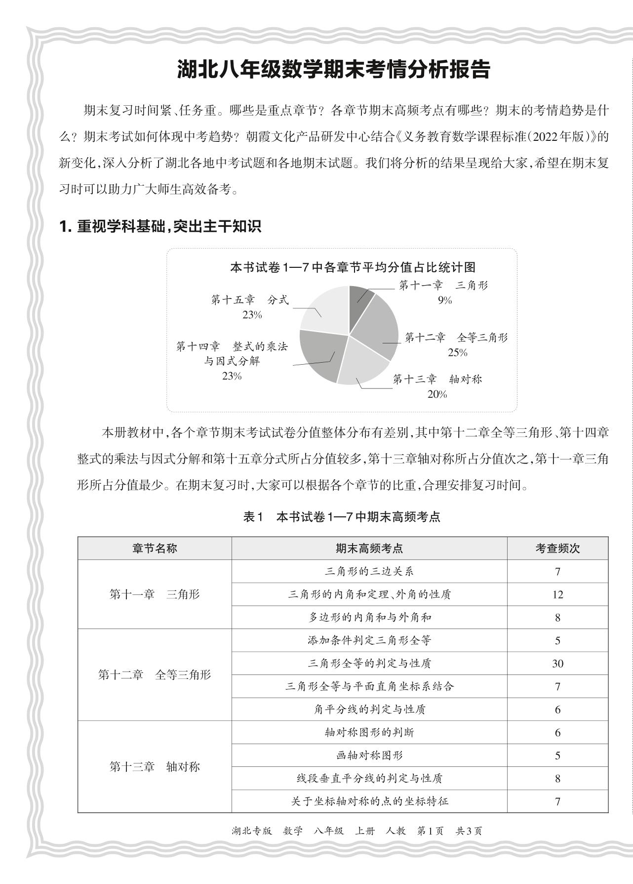 初中数学人教版八年级期末考情分析报告(2023秋湖北)