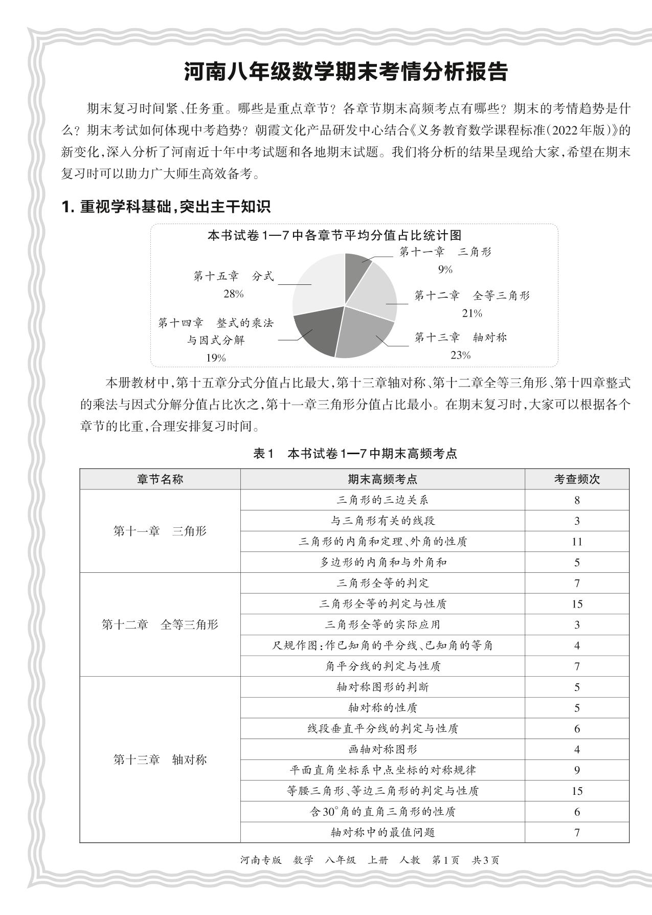 初中数学人教版八年级期末考情分析报告(2023秋河南)