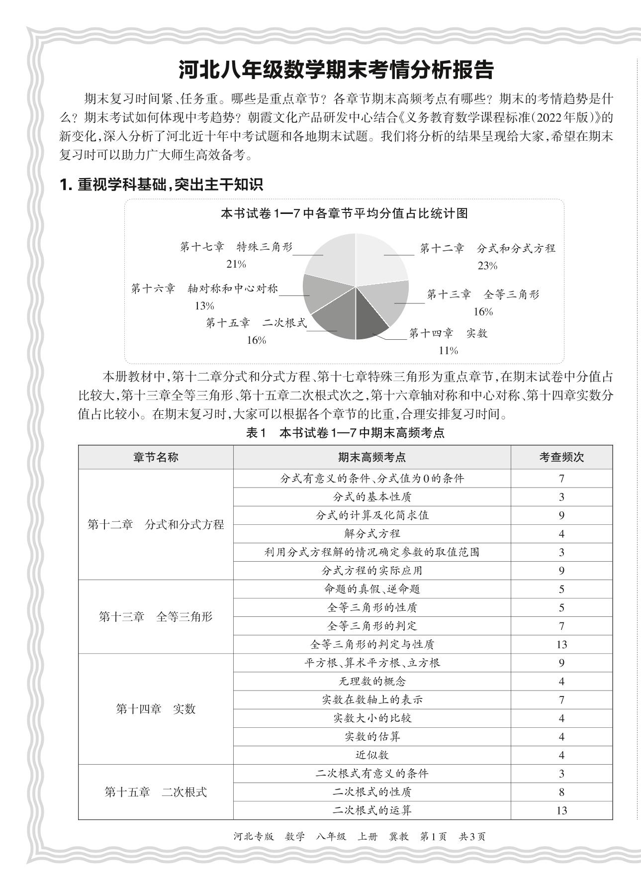 初中数学冀教版八年级期末考情分析报告(2023秋河北)
