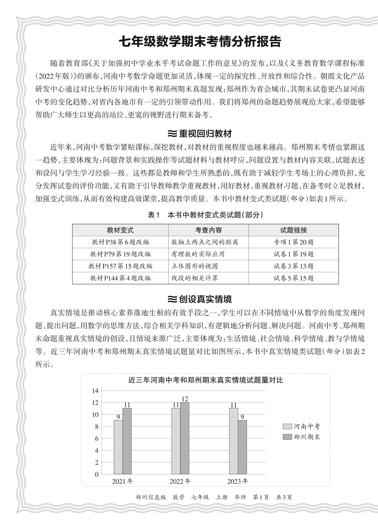 初中数学华师版七年级期末考情分析报告(2023秋郑州)