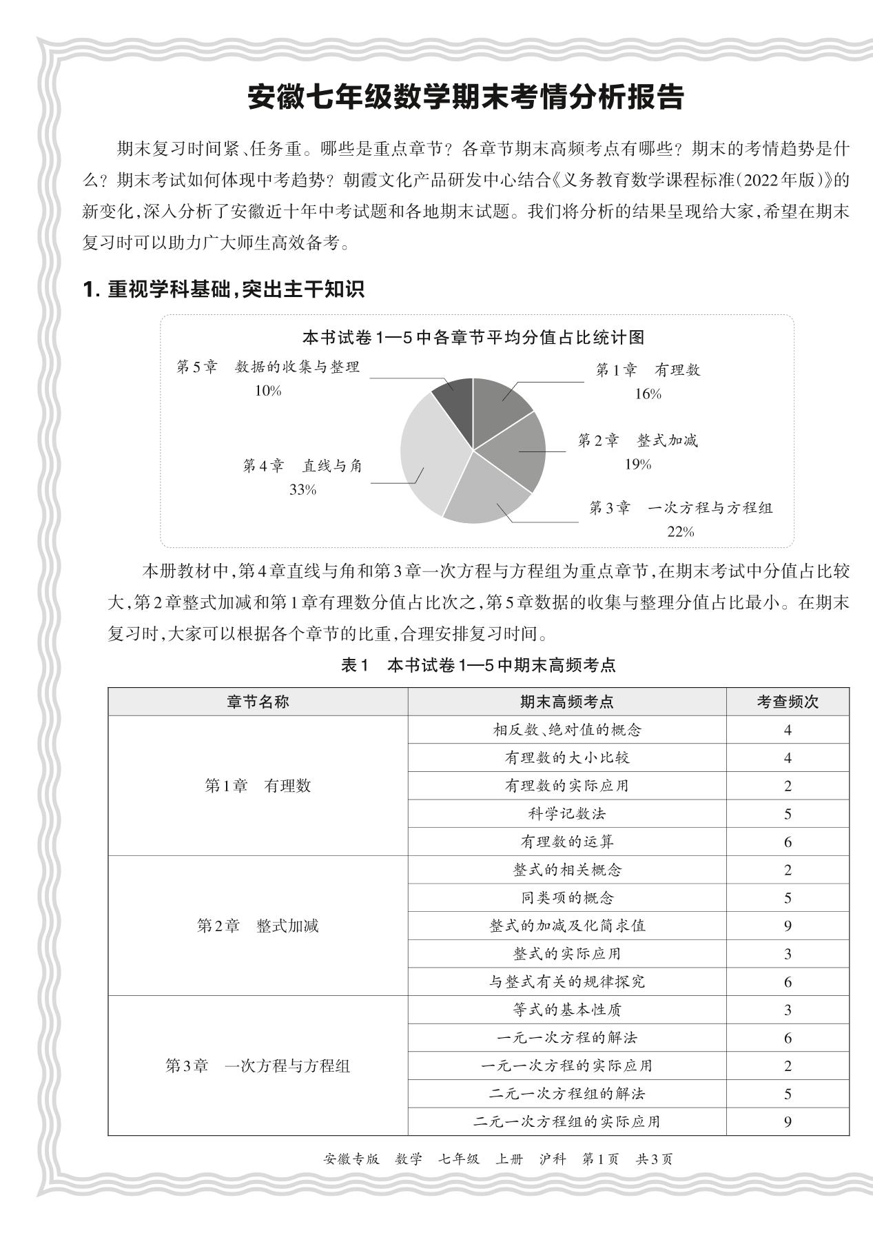 初中数学沪科版七年级期末考情分析报告(2023秋安徽)