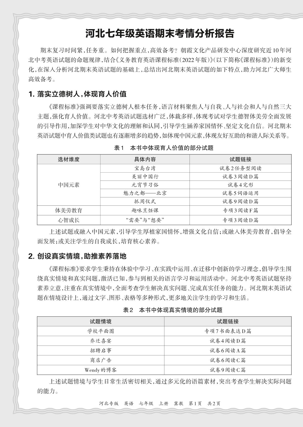 初中英语冀教版七年级期末考情分析报告(2023秋河北)