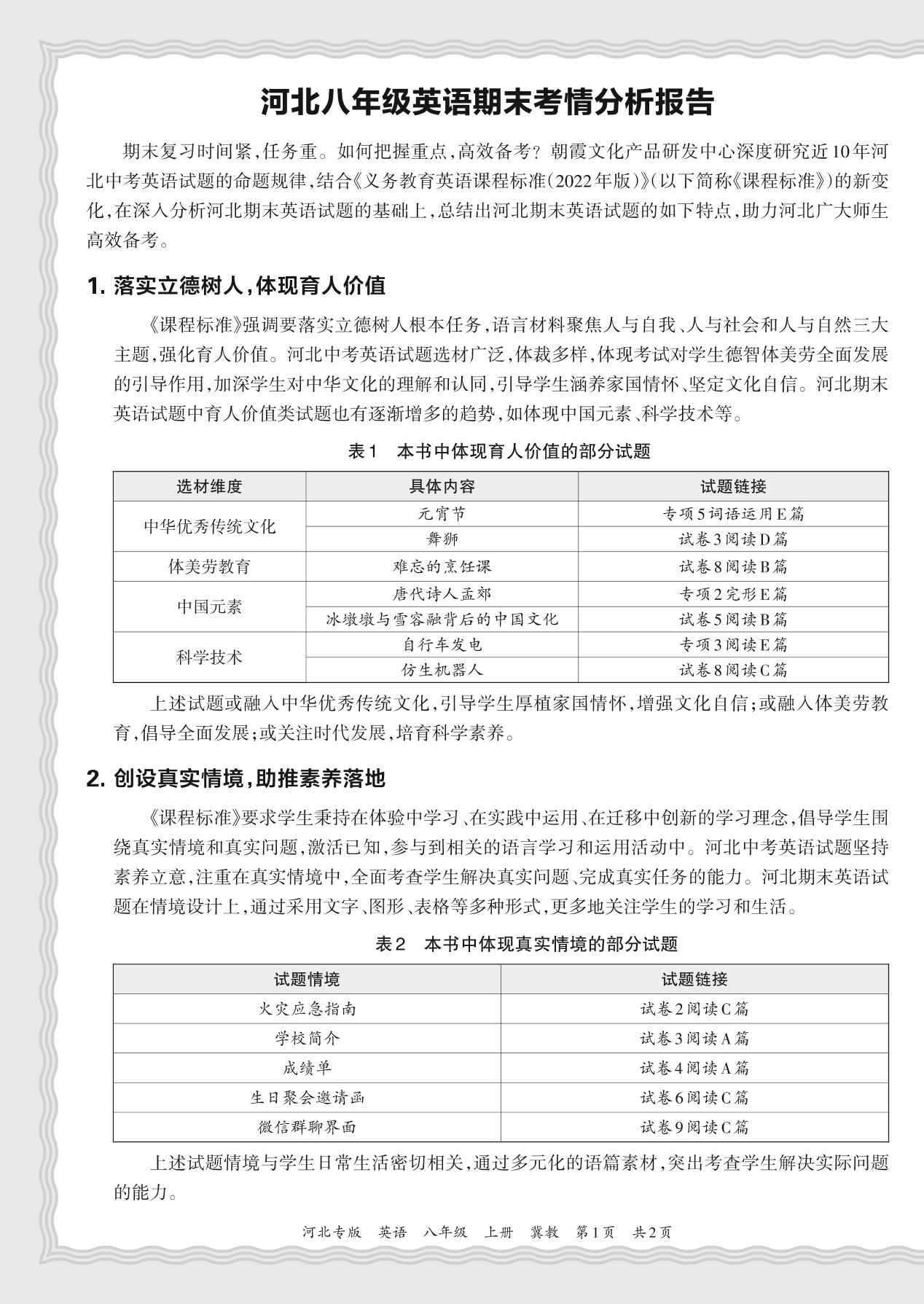 初中英语冀教版八年级期末考情分析报告(2023秋河北)
