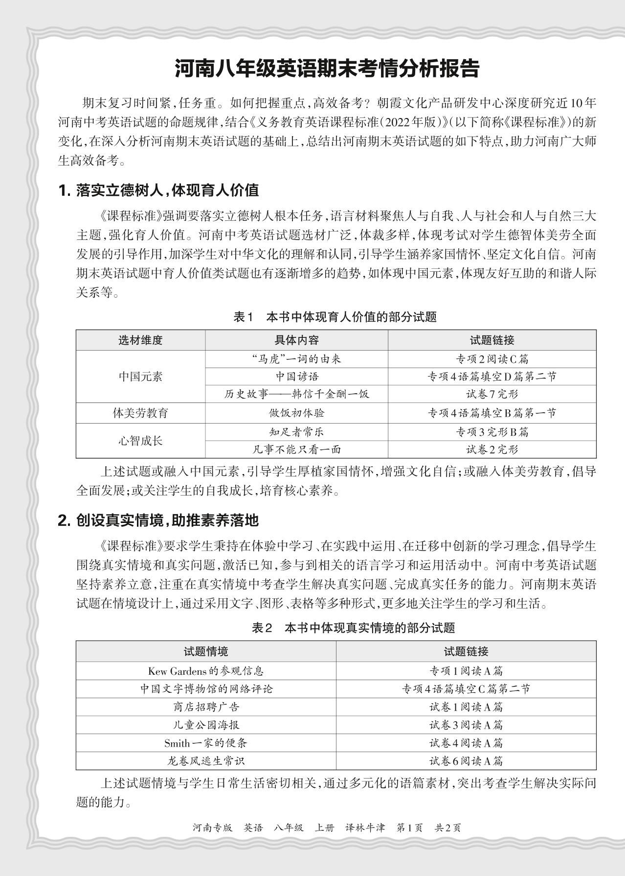 初中英语译林版八年级期末考情分析报告(2023秋河南)