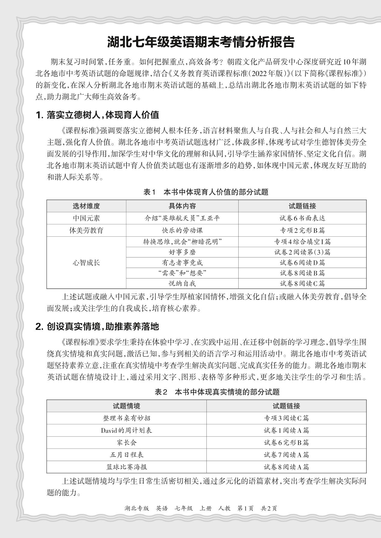 初中英语人教版七年级期末考情分析报告(2023秋湖北)