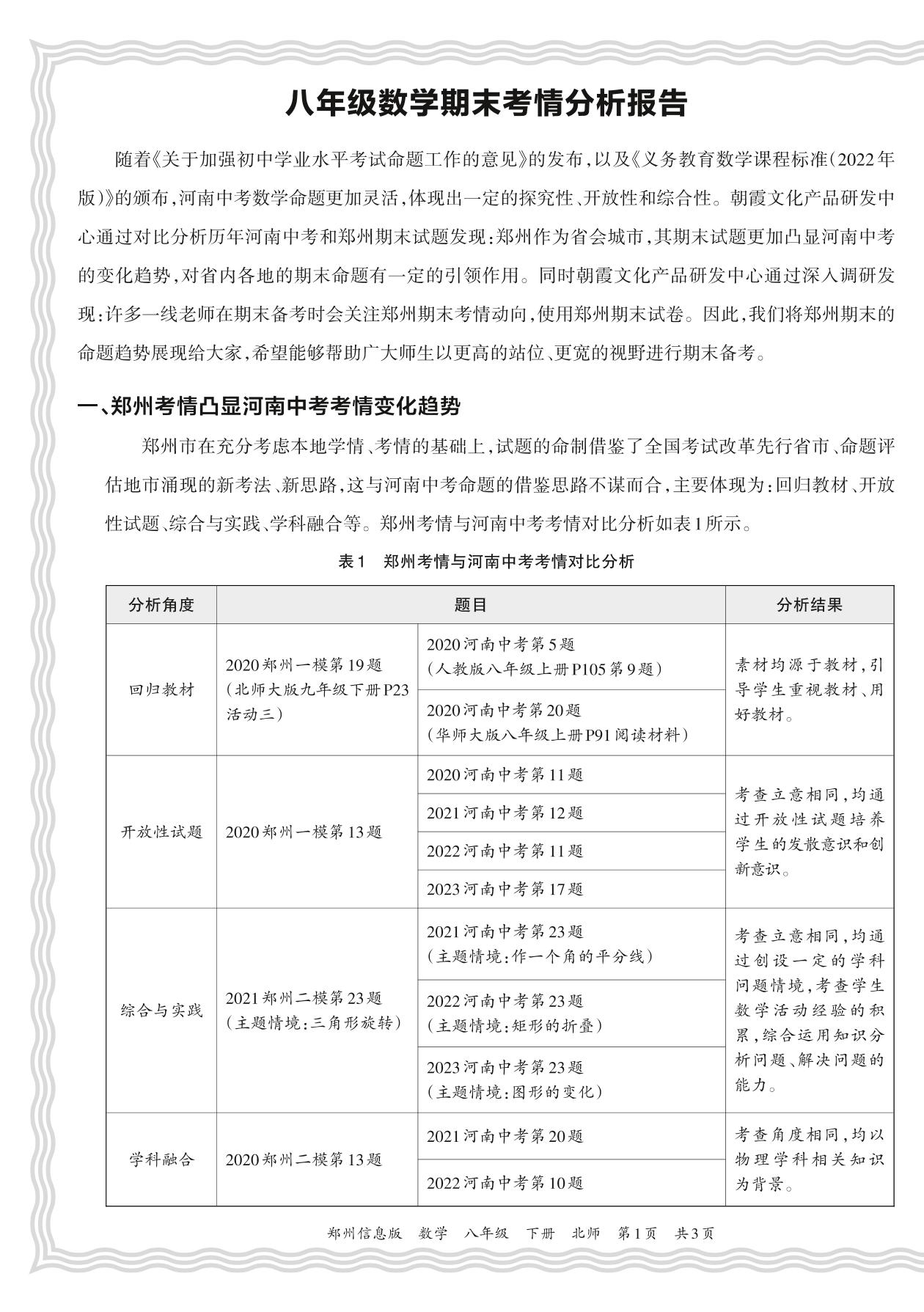 初中数学北师版八年级期末考情分析报告(2024春郑州)