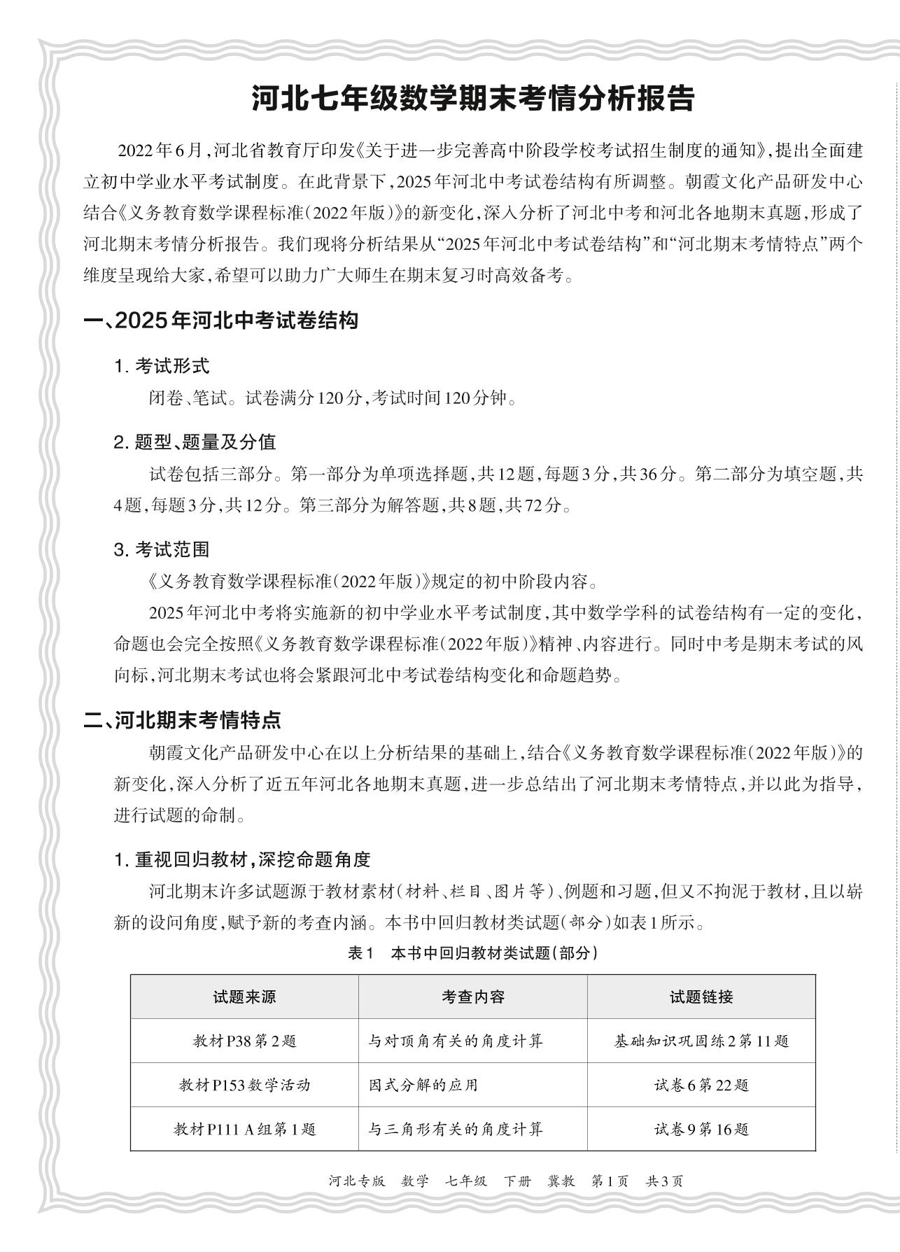 初中数学冀教版七年级期末考情分析报告(2024春河北)