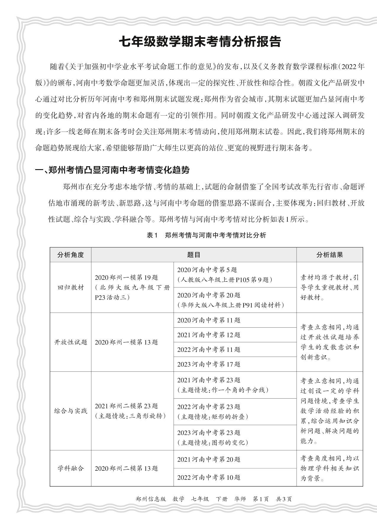 初中数学华师版七年级期末考情分析报告(2024春郑州)