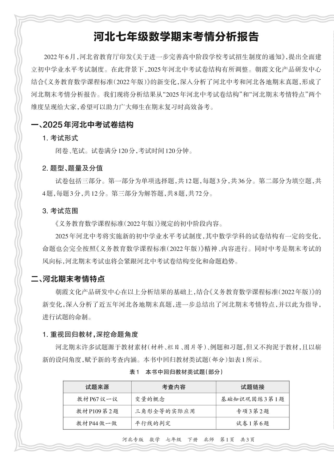 初中数学北师版七年级期末考情分析报告(2024春河北)