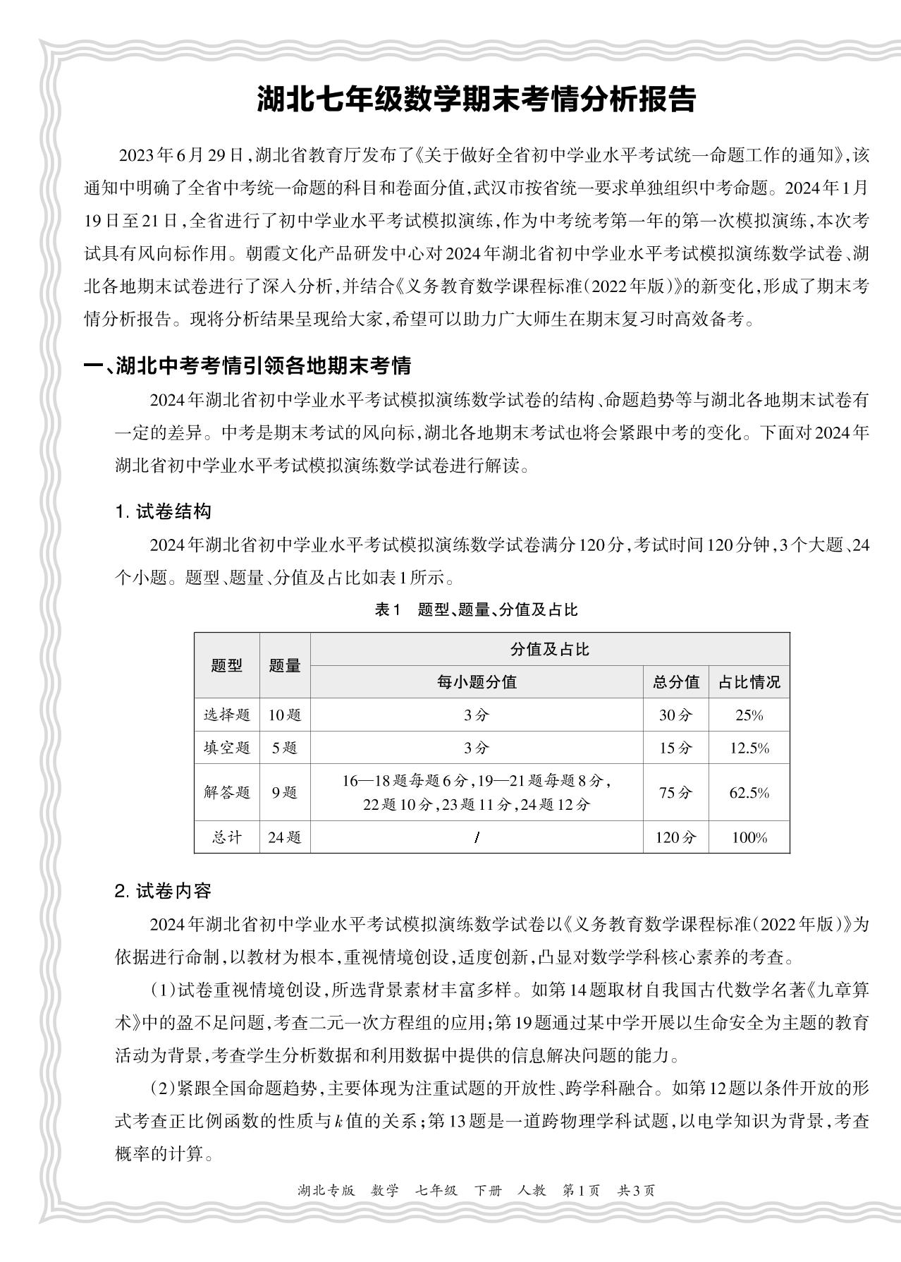 初中数学人教版七年级期末考情分析报告(2024春湖北)