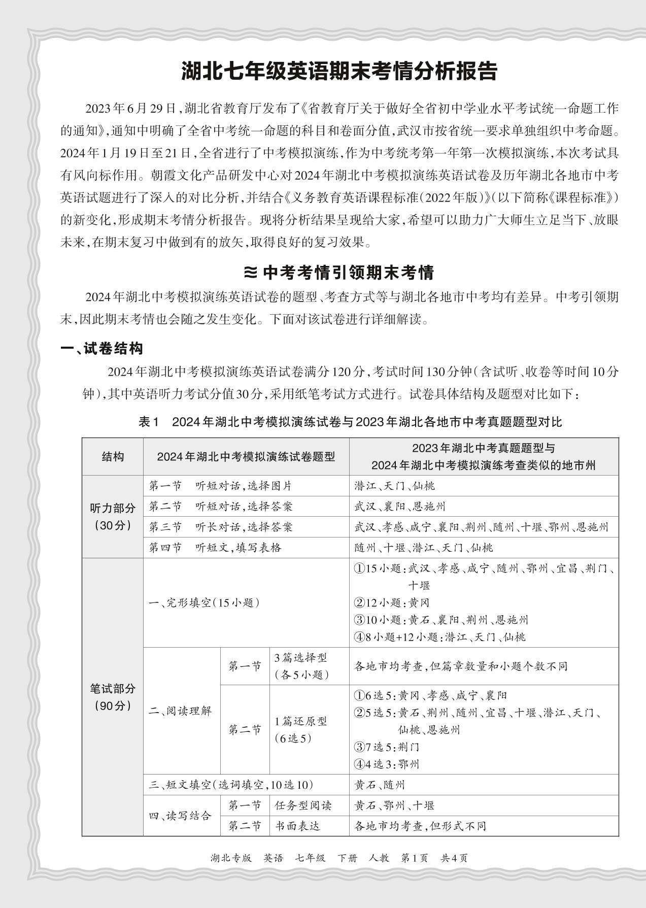 初中英语人教版七年级期末考情分析报告(2024春湖北)