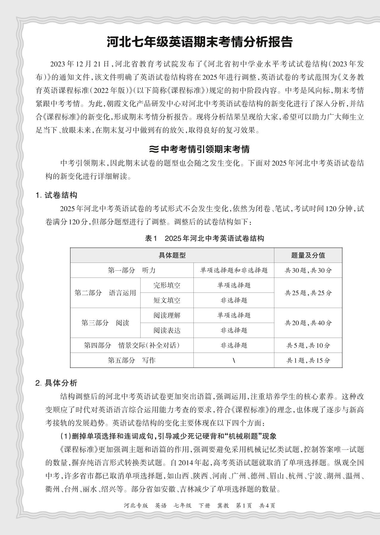 初中英语冀教版七年级期末考情分析报告(2024春河北)