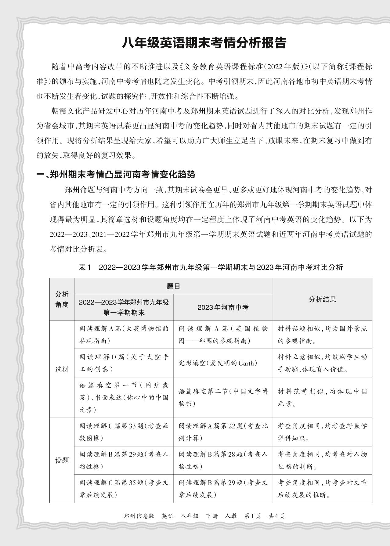 初中英语人教版八年级期末考情分析报告(2024春郑州)