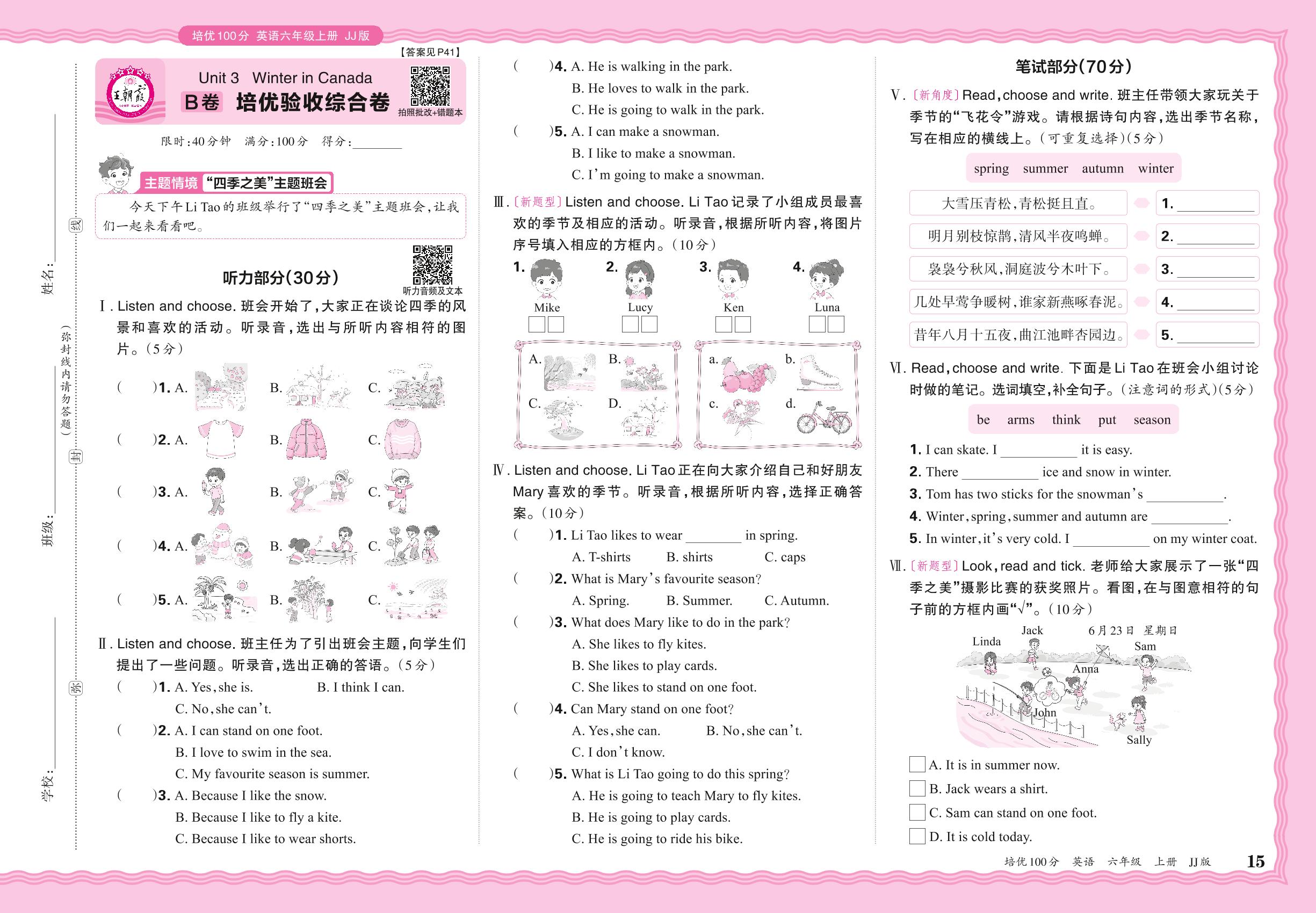 2024秋上册六年级英语冀教版 Unit 3 B卷 培优验收综合卷