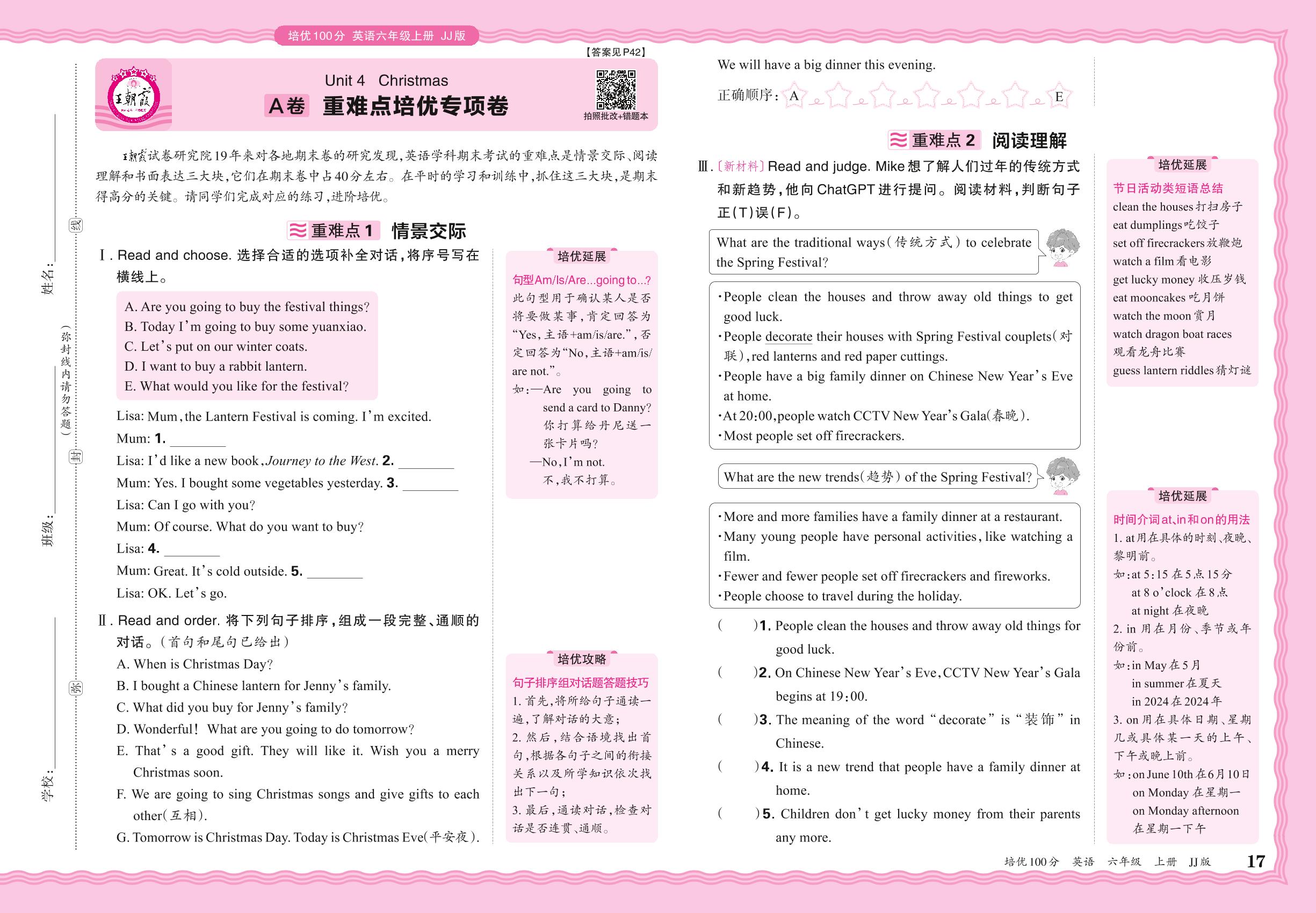 2024秋上册六年级英语冀教版 Unit 4 A卷 重难点培优专项卷