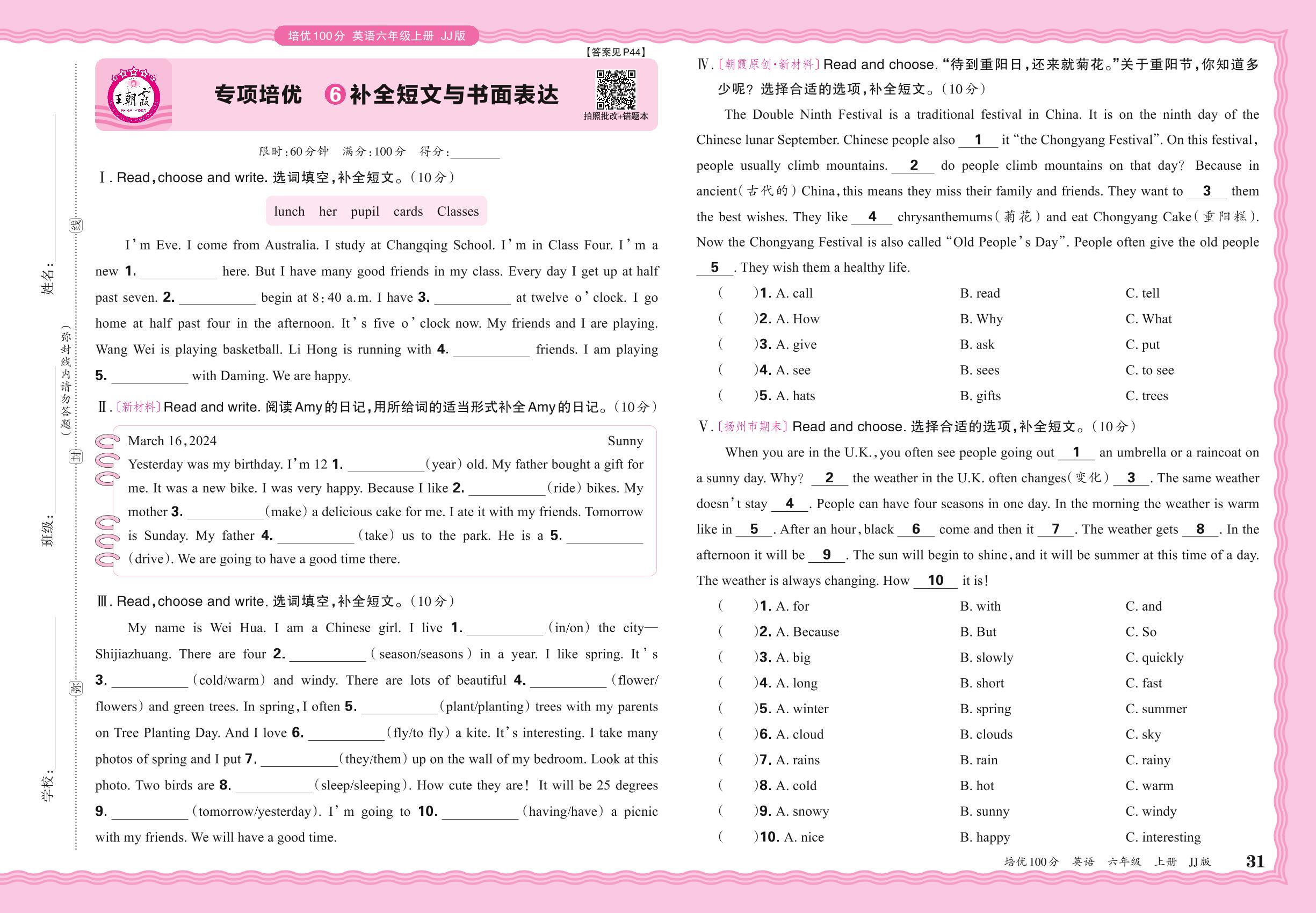 2024秋上册六年级英语冀教版 期末专项卷PY版·补全短文与书面表达【6】