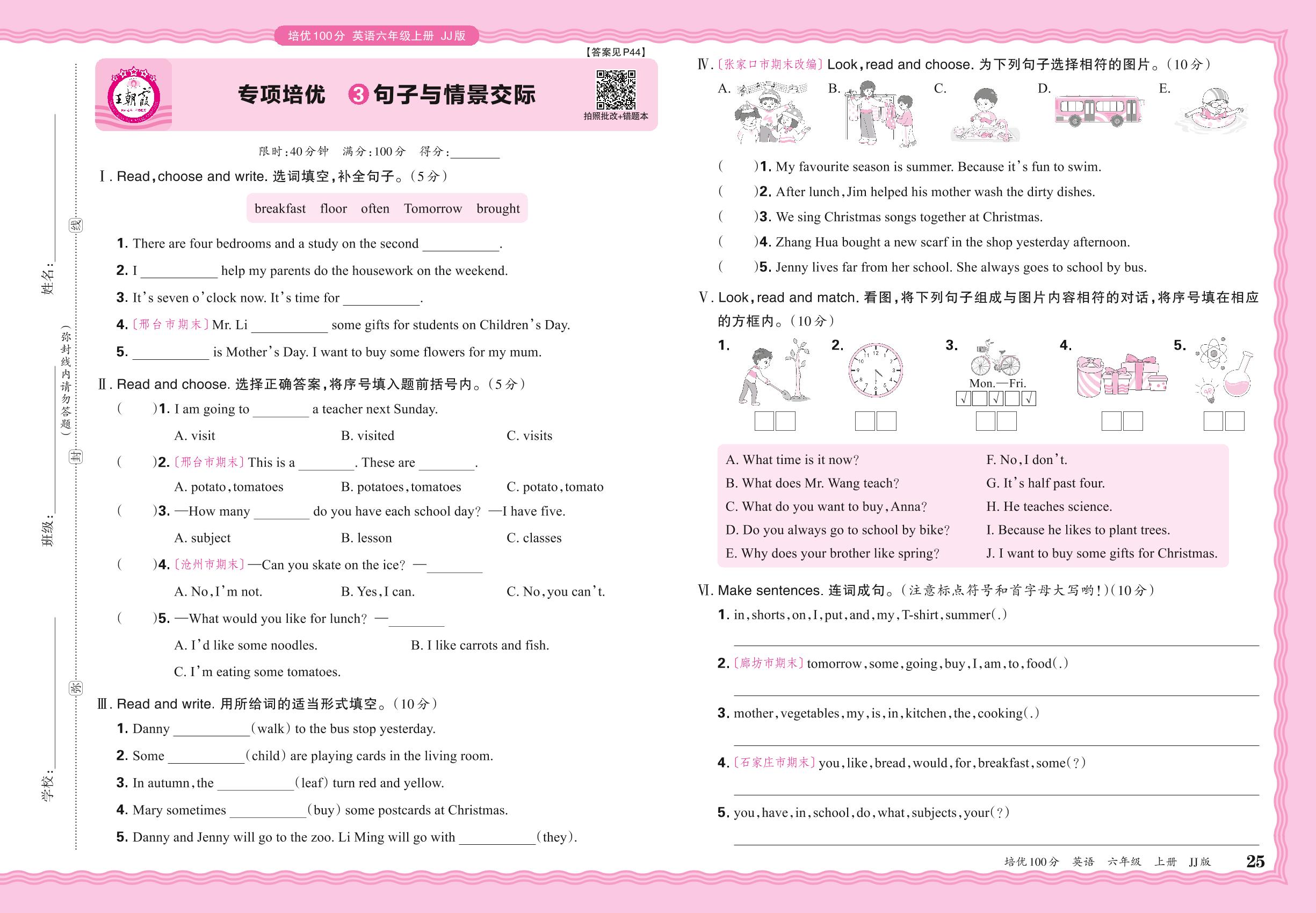 2024秋上册六年级英语冀教版 期末专项卷PY版·句子与情景交际【3】