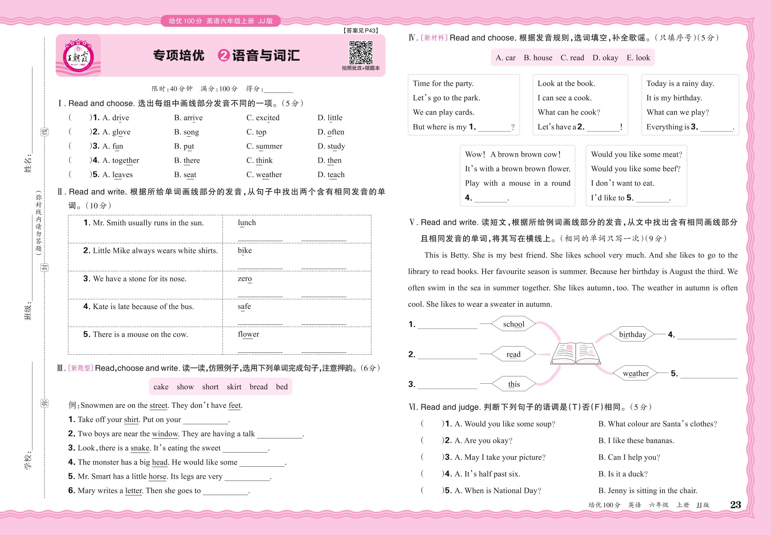 2024秋上册六年级英语冀教版 期末专项卷PY版·语音与词汇【2】