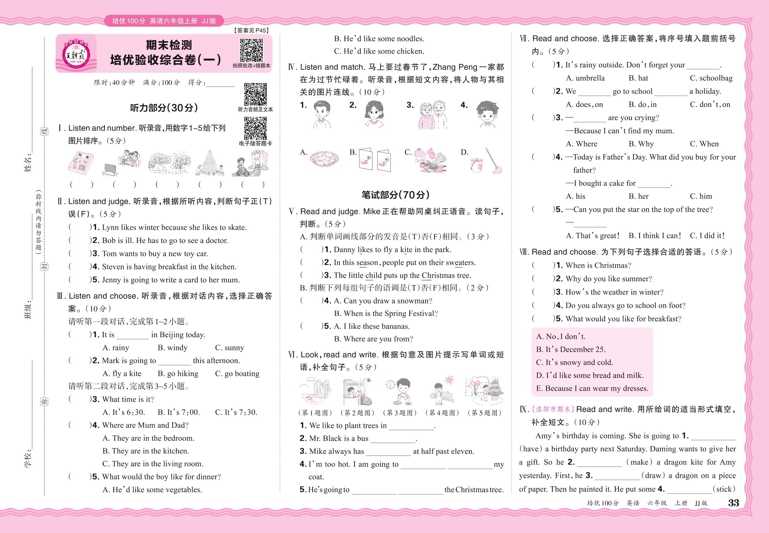 2024秋上册六年级英语冀教版 期末检测 培优验收综合卷(一)