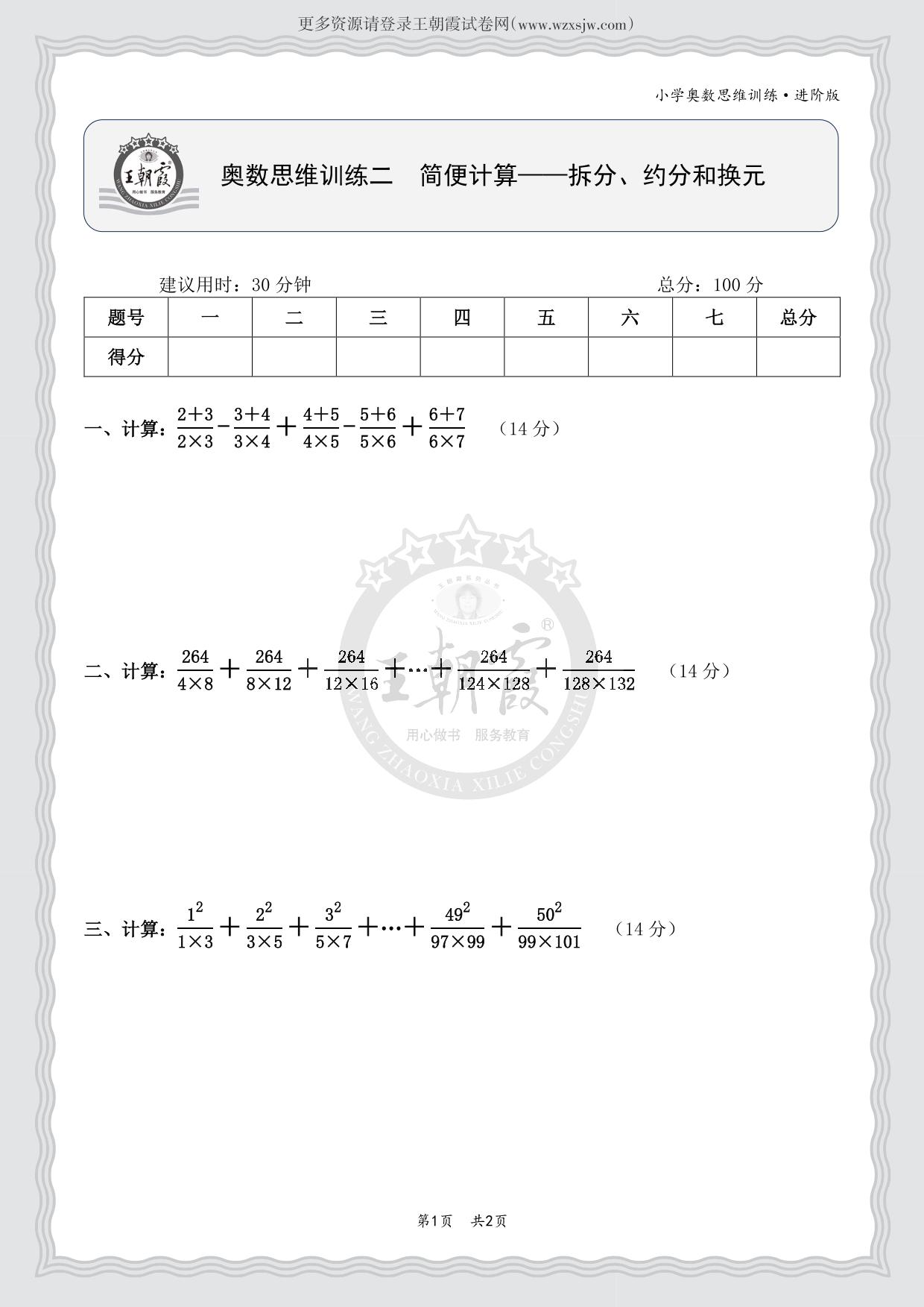 小学奥数思维训练二 简便计算——拆分、约分和换元(进阶版)