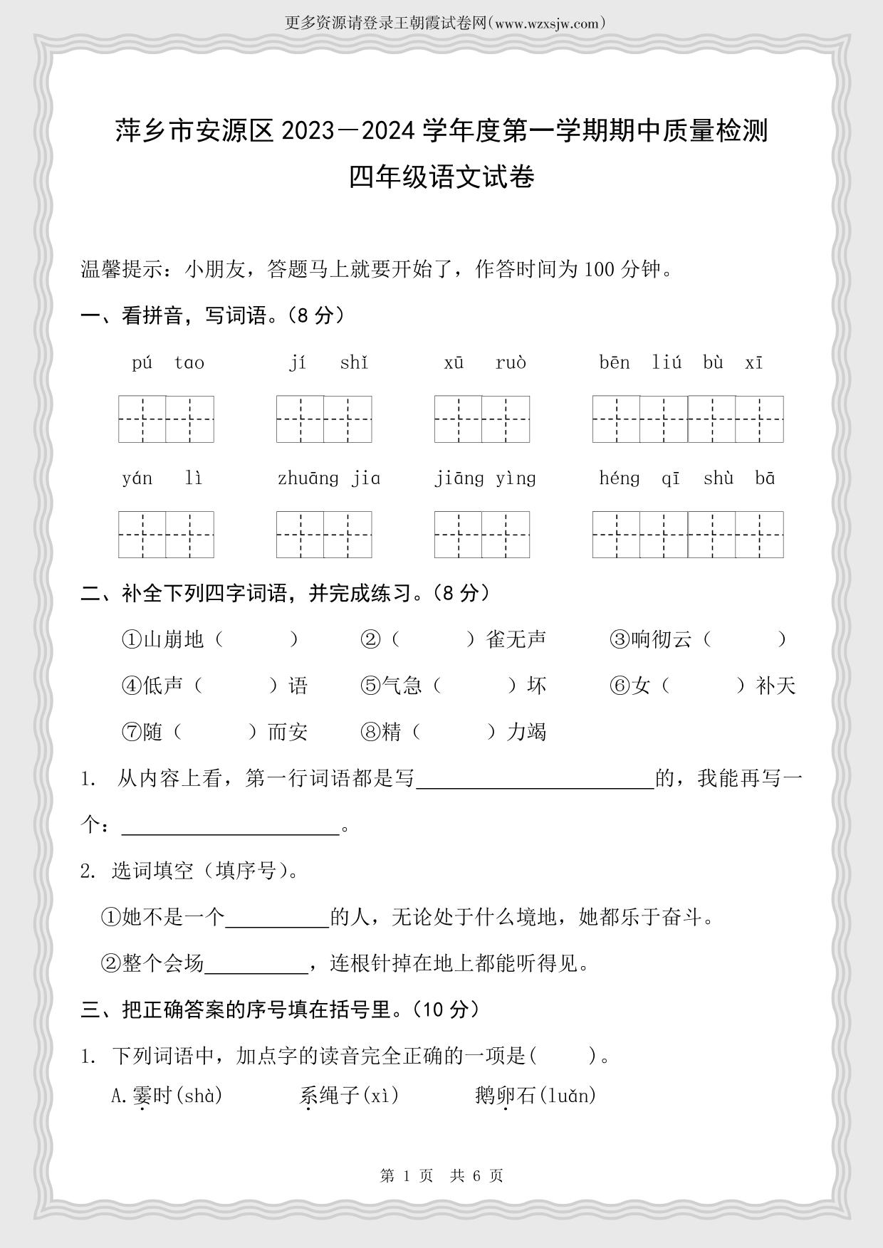 江西省萍乡市安源区2023-2024学年度第一学期期中质量检测试卷四年级语文(人教版)