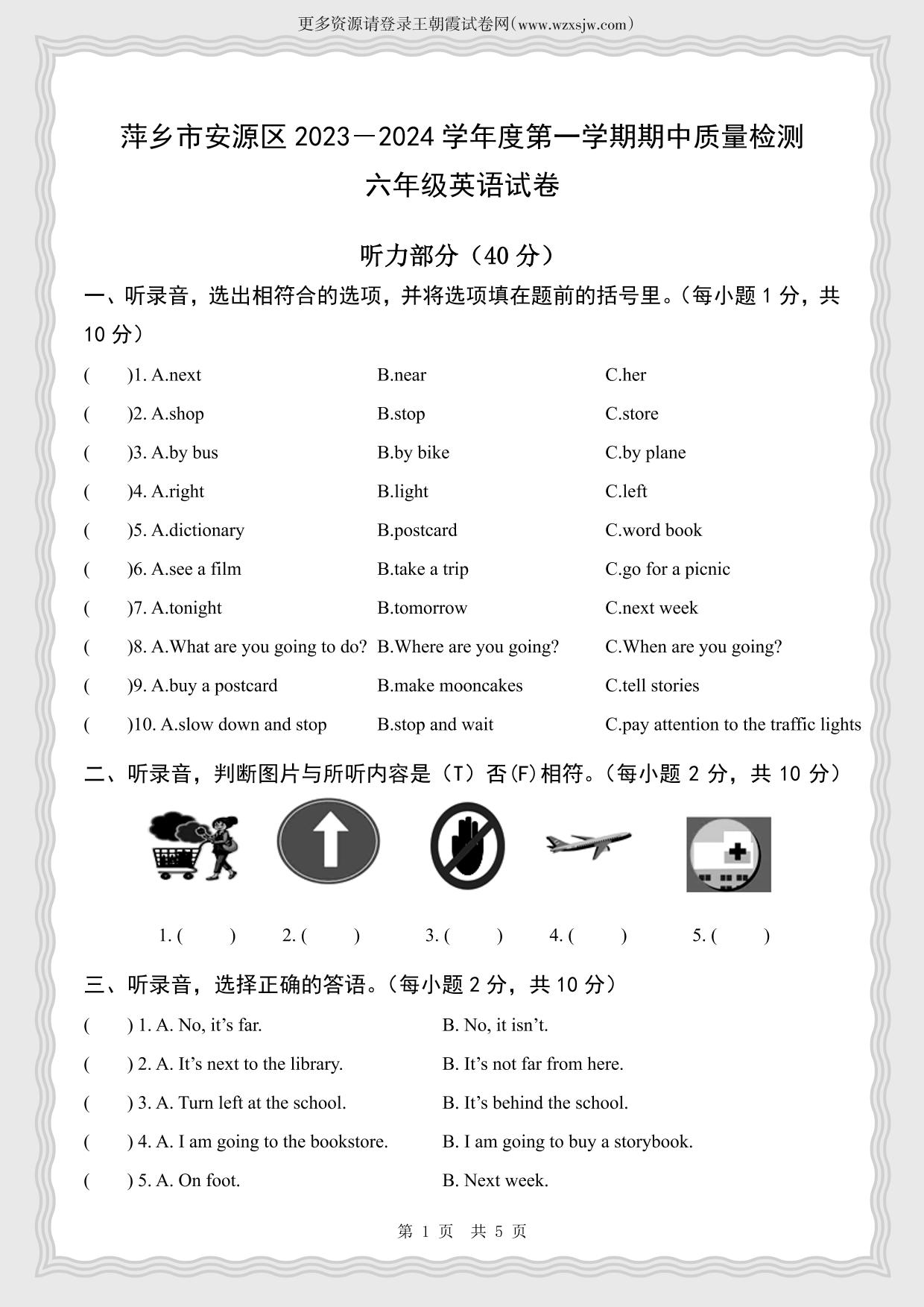 江西省萍乡市安源区2023-2024学年度第一学期期中质量检测试卷六年级英语(人教PEP版)【无听力音频】