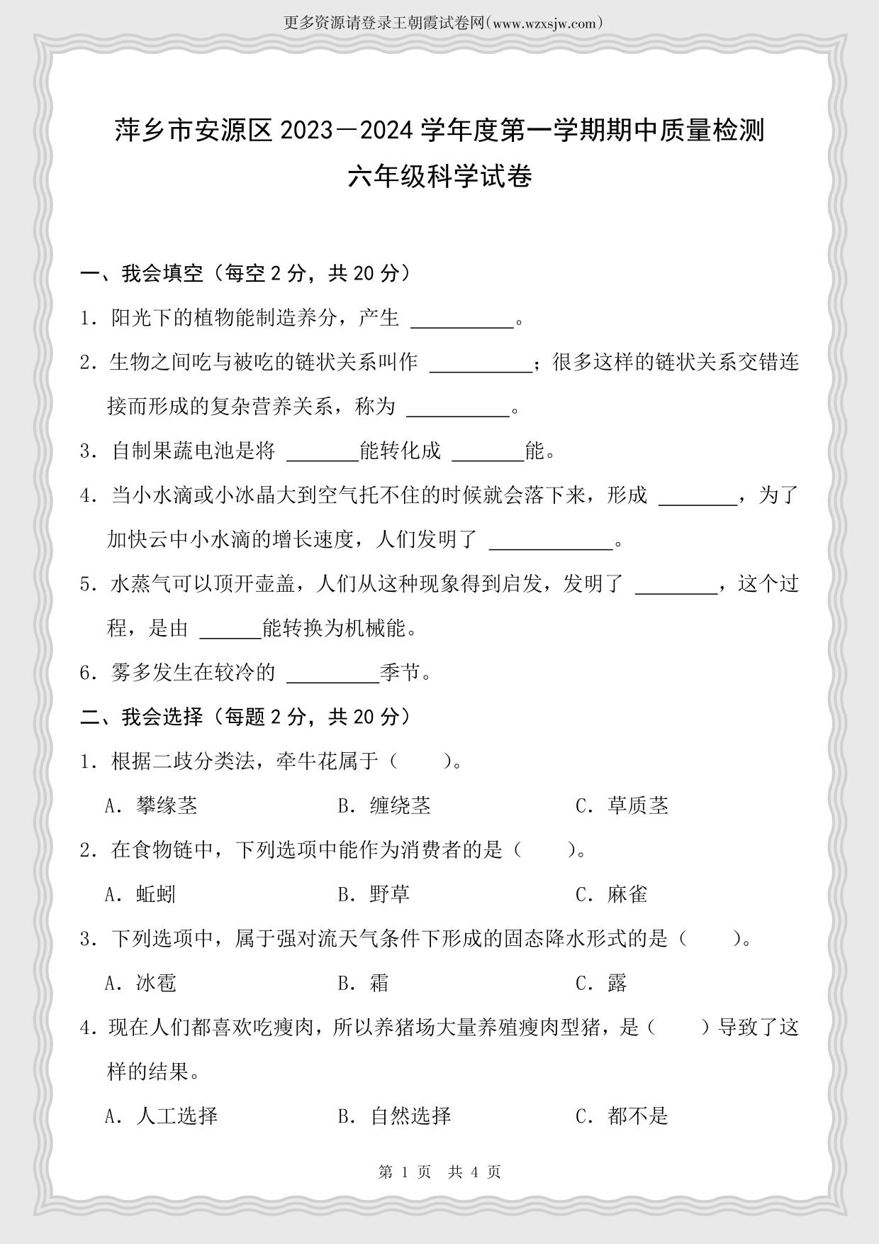 江西省萍乡市安源区2023-2024学年度第一学期期中质量检测试卷六年级科学(湘教版)