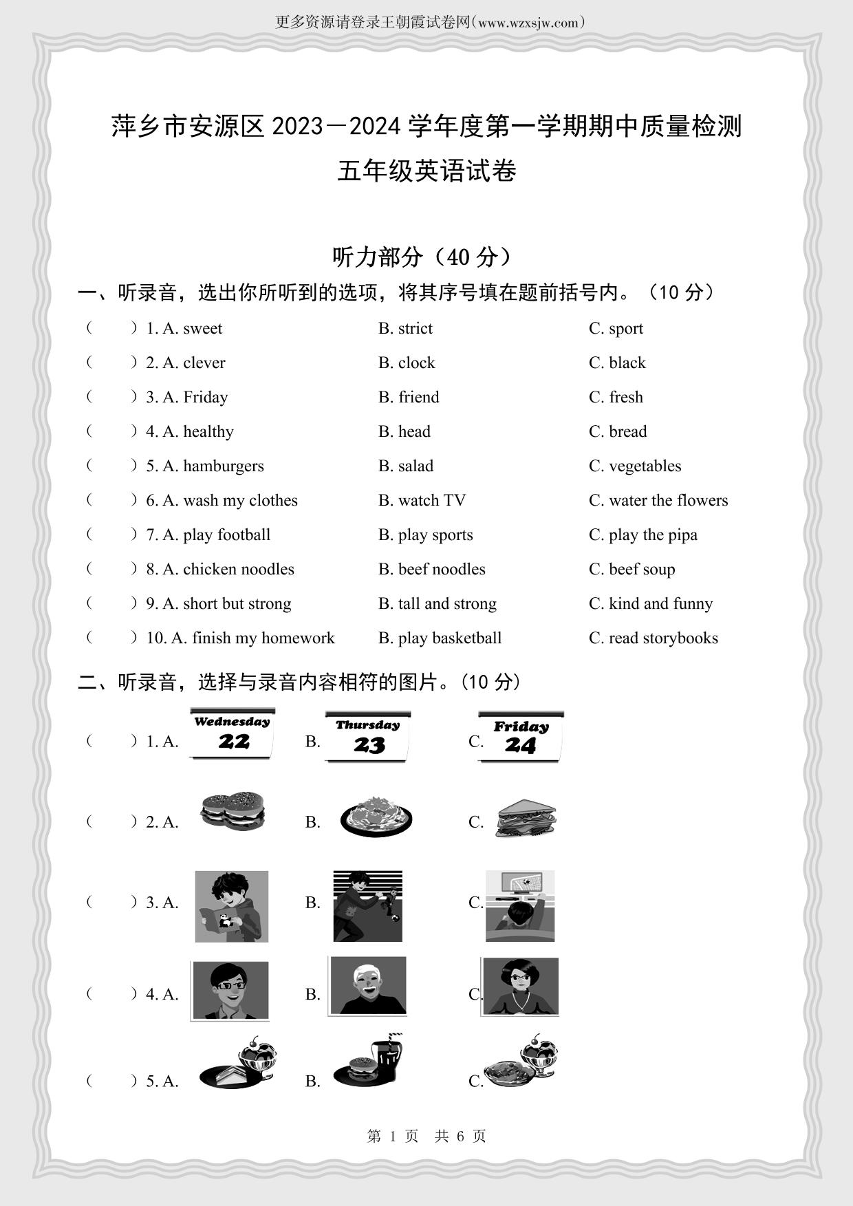 江西省萍乡市安源区2023-2024学年度第一学期期中质量检测试卷五年级英语(人教PEP版)【无听力音频】