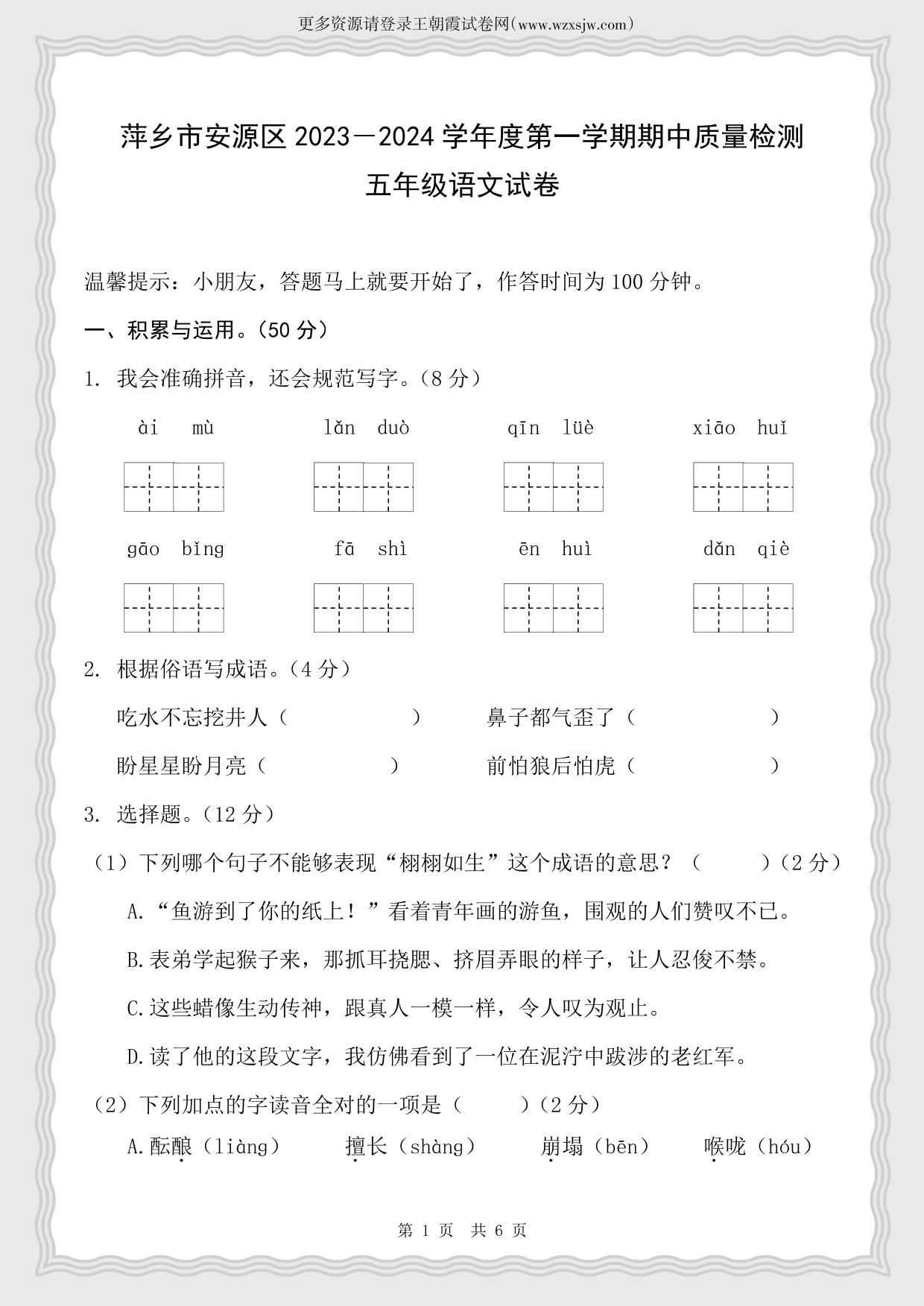 江西省萍乡市安源区2023-2024学年度第一学期期中质量检测试卷五年级语文(人教版)