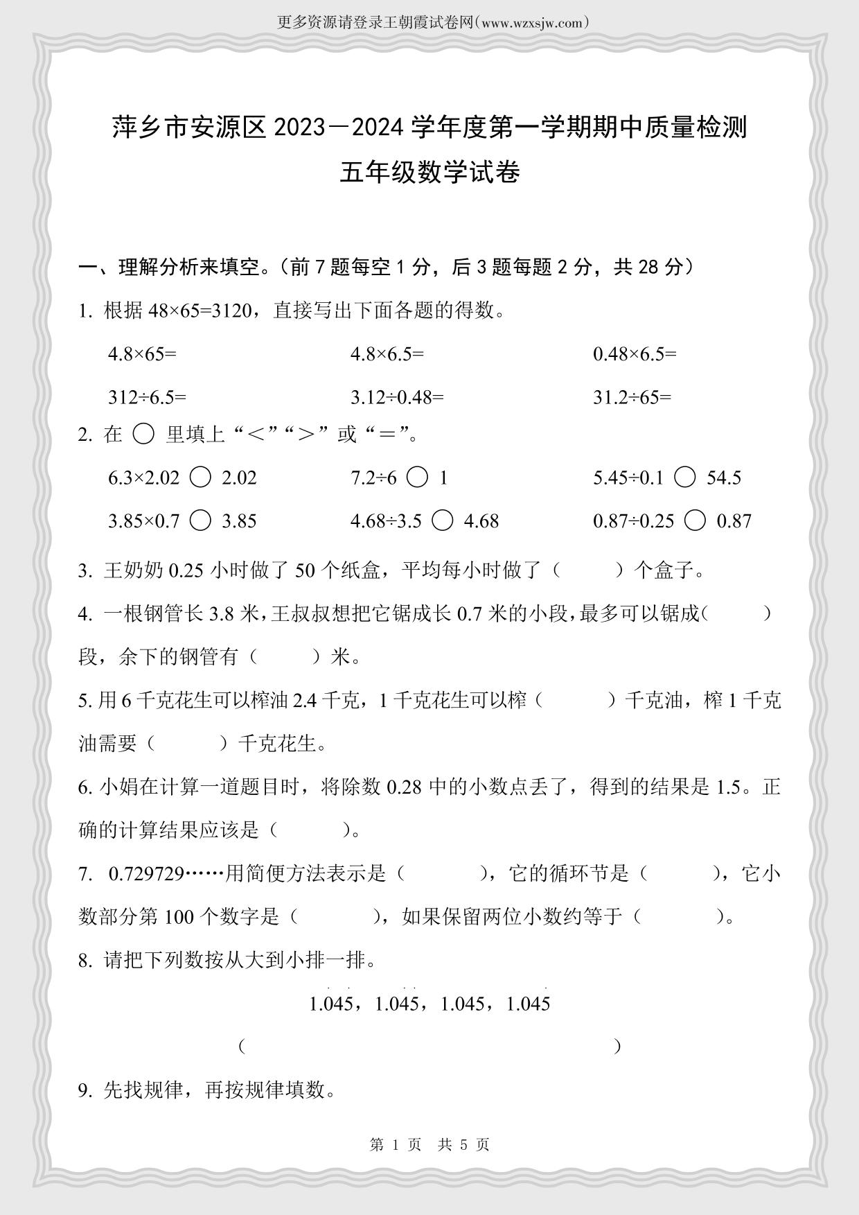 江西省萍乡市安源区2023-2024学年度第一学期期中质量检测试卷五年级数学(人教版)
