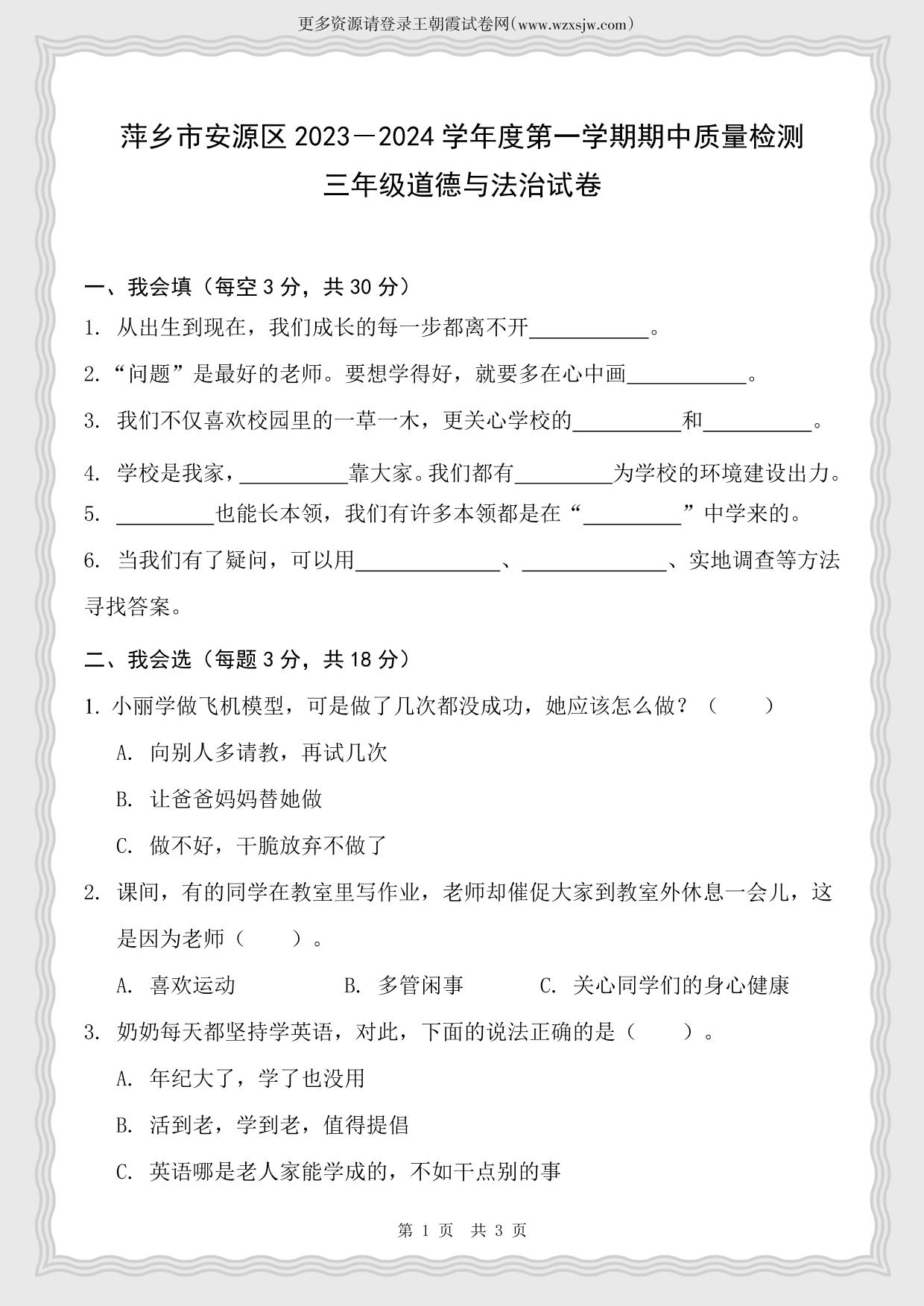 江西省萍乡市安源区2023-2024学年度第一学期期中质量检测试卷三年级道德与法治(人教版)