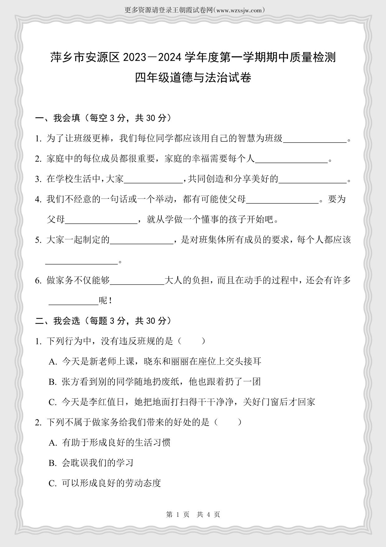 江西省萍乡市安源区2023-2024学年度第一学期期中质量检测试卷四年级道德与法治(人教版)