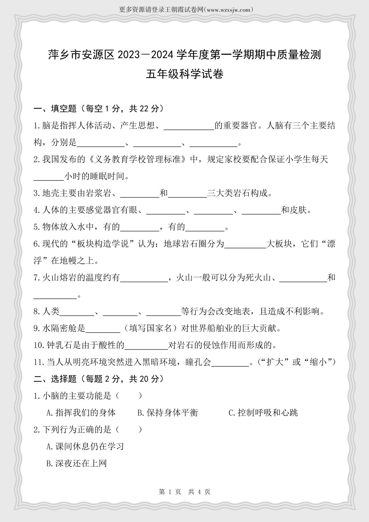 江西省萍乡市安源区2023-2024学年度第一学期期中质量检测试卷五年级科学(湘教版)