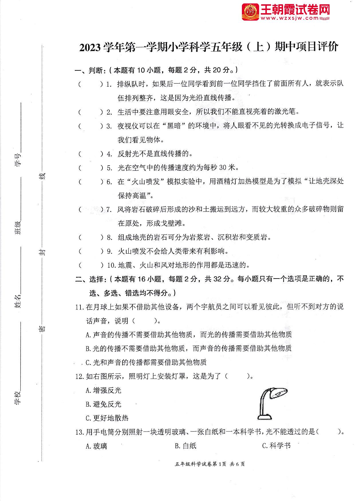 五年级科学教科版上册期中卷