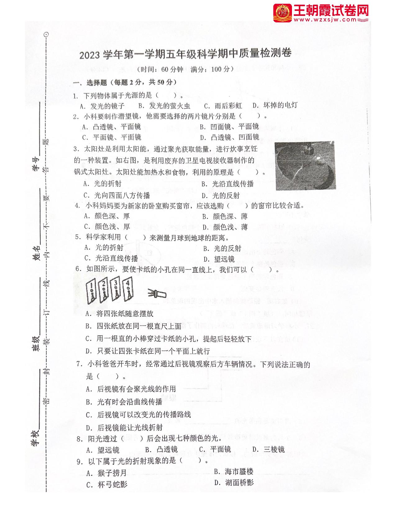 浙江省台州市三门县2023-2024学年第一学期期中质量检测卷五年级科学(教科版)