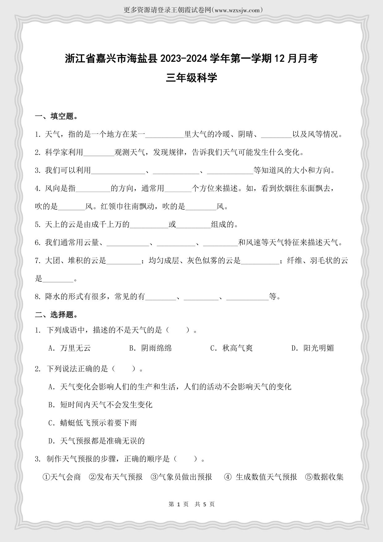 浙江省嘉兴市海盐县2023-2024学年第一学期12月月考三年级科学(教科版)