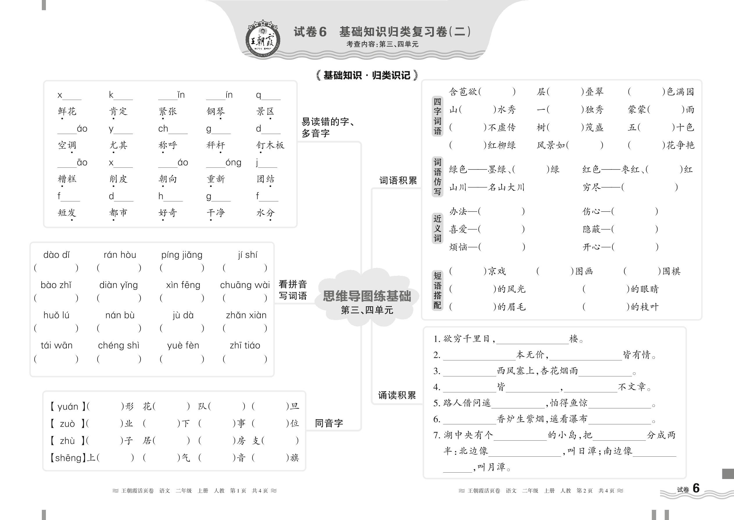 2024秋上册二年级语文人教版 第三、四单元基础知识归类复习卷【6】