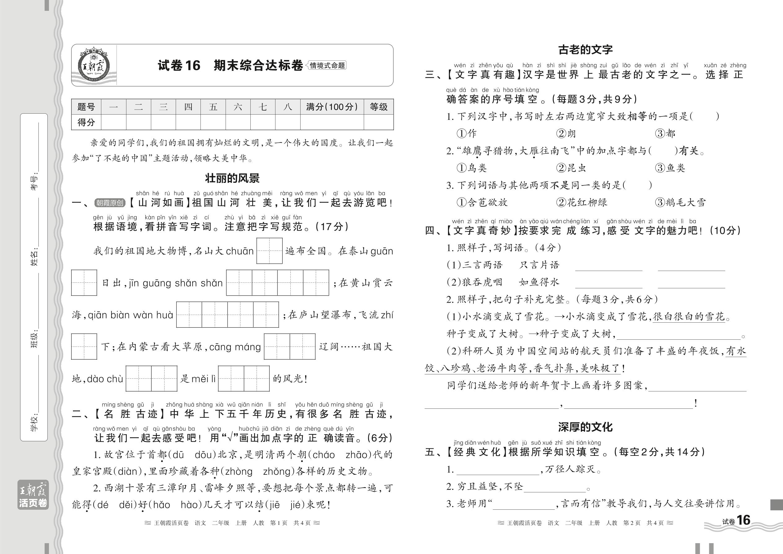 2024秋上册二年级语文人教版 期末综合达标卷【16】