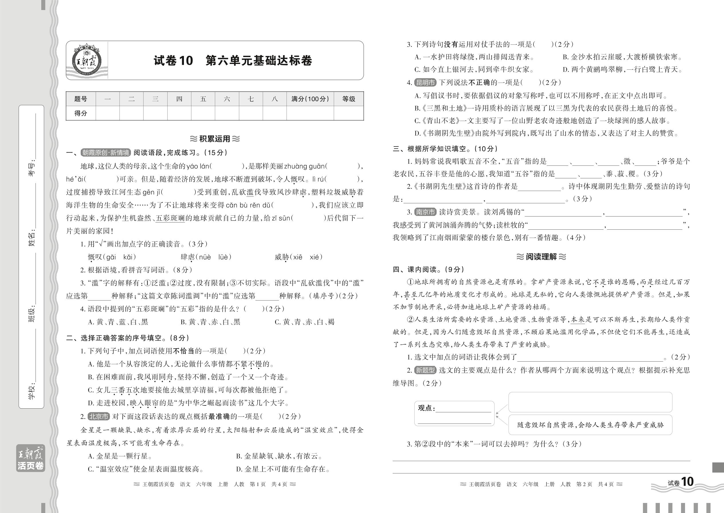 2024秋上册六年级语文人教版 第六单元基础达标卷【10】