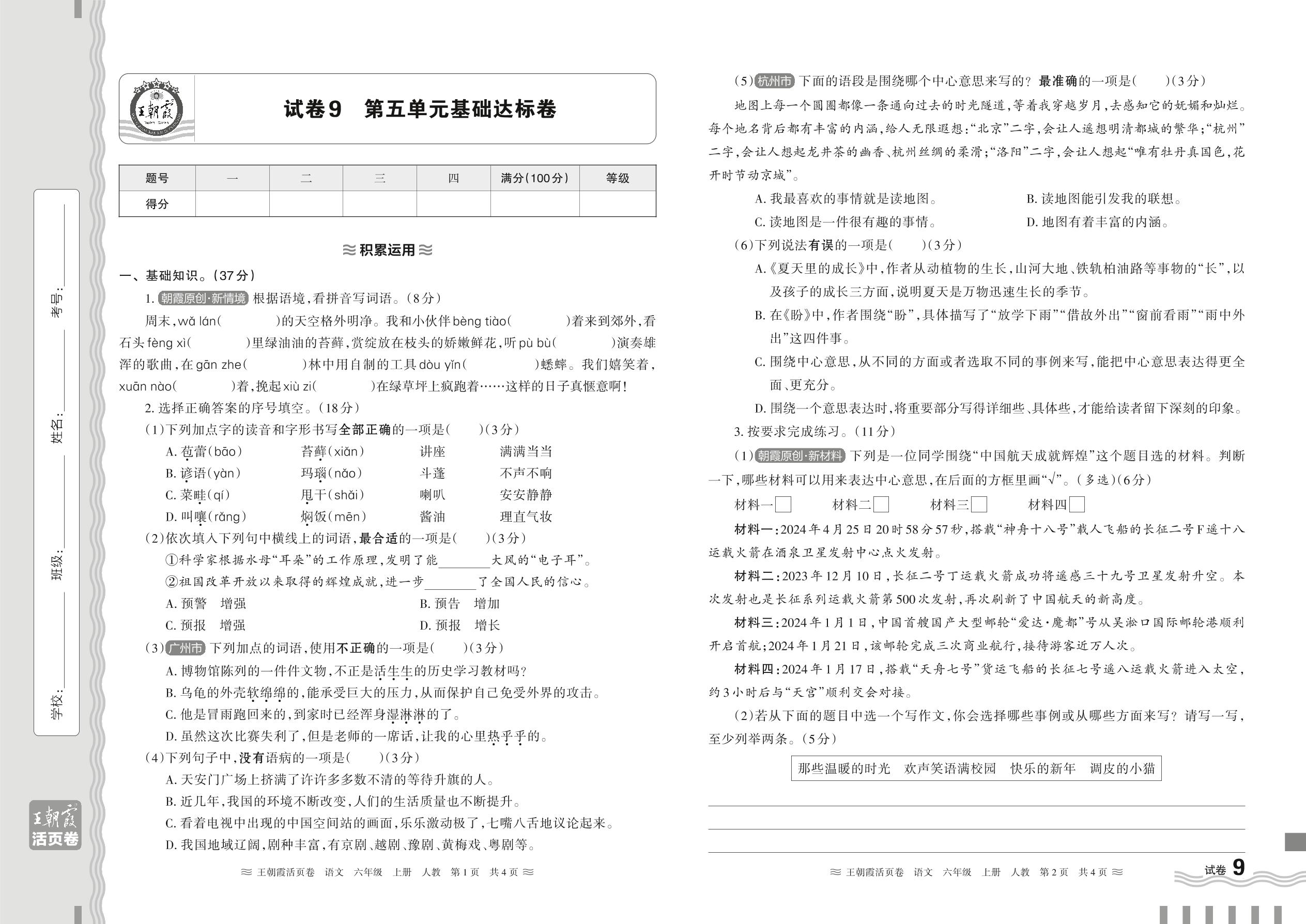 2024秋上册六年级语文人教版 第五单元基础达标卷【9】
