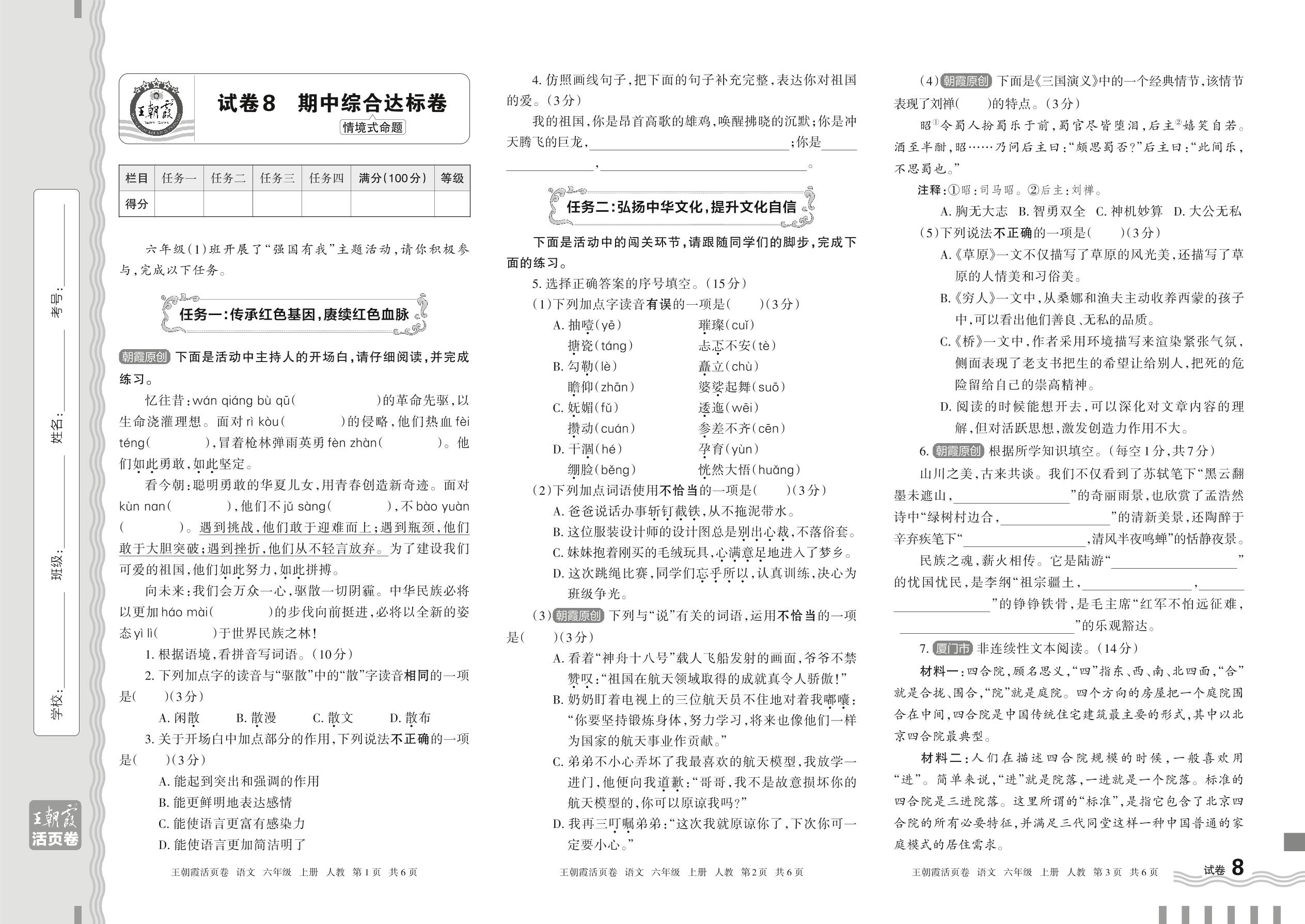 2024秋上册六年级语文人教版 期中综合达标卷【8】